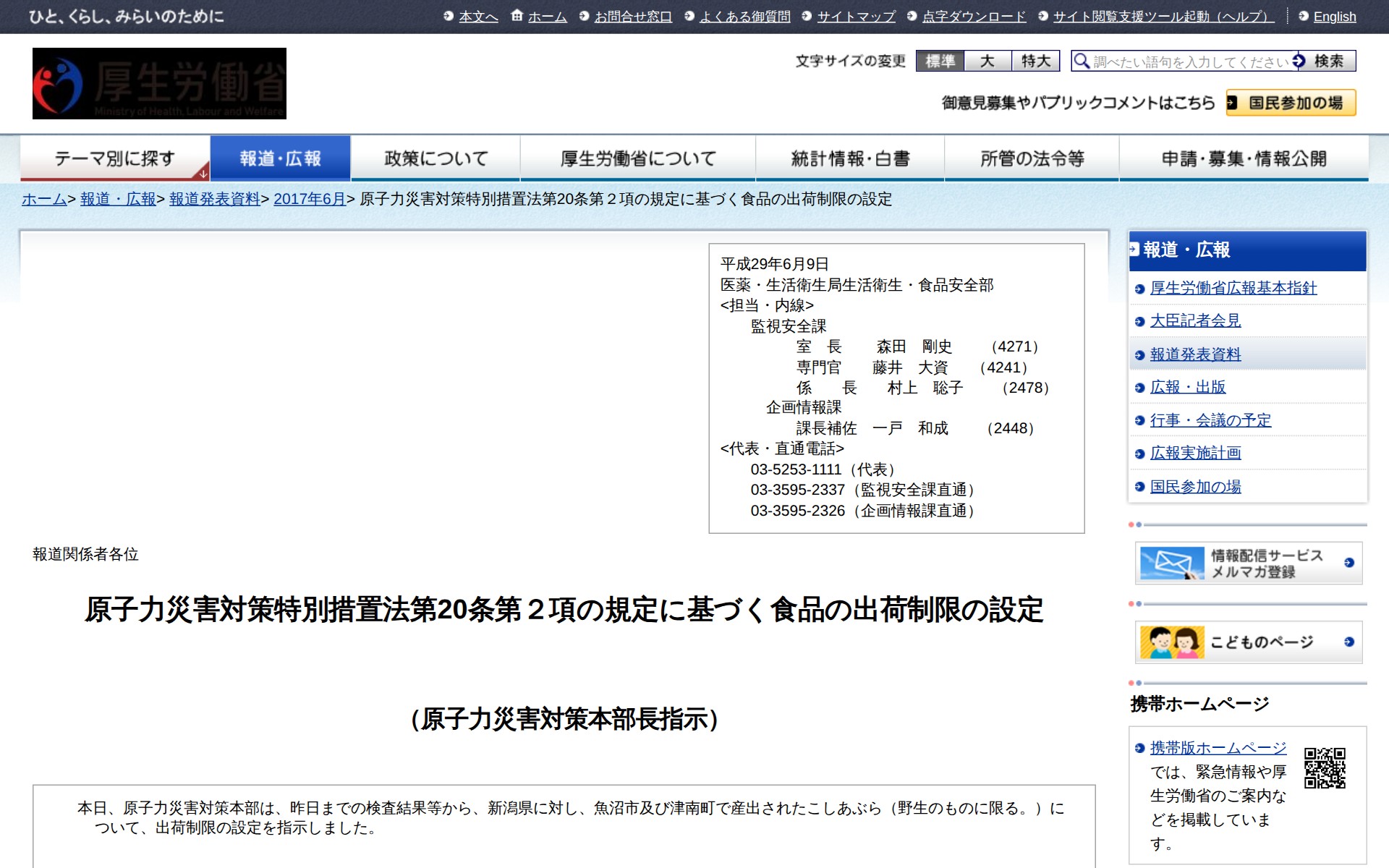 このページは、2017年6月9日付けで厚生労働省が発表した、原子力災害対策特別措置法に基づく食品出荷制限に関する報道資料である。原子力災害対策本部は、新潟県の魚沼市及び津南町で産出された野生のこしあぶらについて出荷制限を指示した。魚沼市では平成29年5月10日の検査で150Bq/kg、津南町では5月16日の検査で120Bq/kgの放射能が検出されたため、これに基づく措置である。