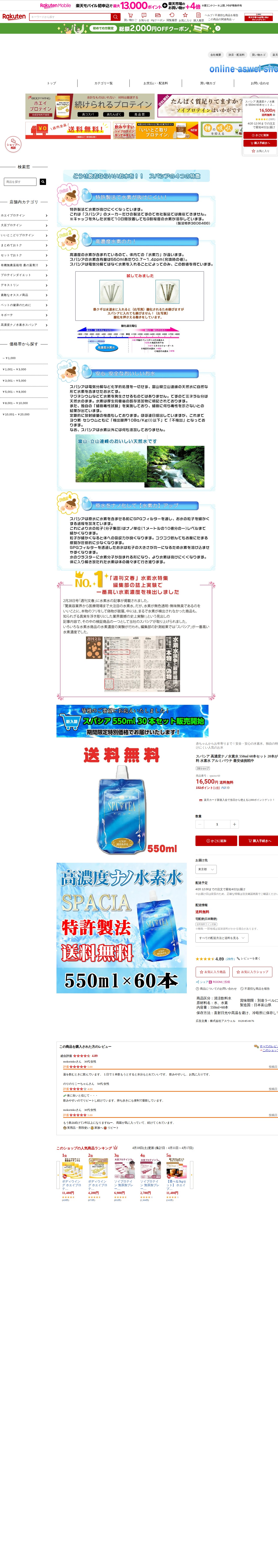 このページは、楽天市場で販売されているスパシア高濃度ナノ水素水の商品情報です。550ml×60本セット(20本が3ケース)で16,500円、送料無料です。特許製法により水素が抜けにくく、赤ちゃんからお年寄りまで安全に飲用できます。アルミパウチ容器で携帯に便利で、日本富山県製造です。顧客評価は4.89点と高く、飲みやすさと継続使用での満足度が評価されています。