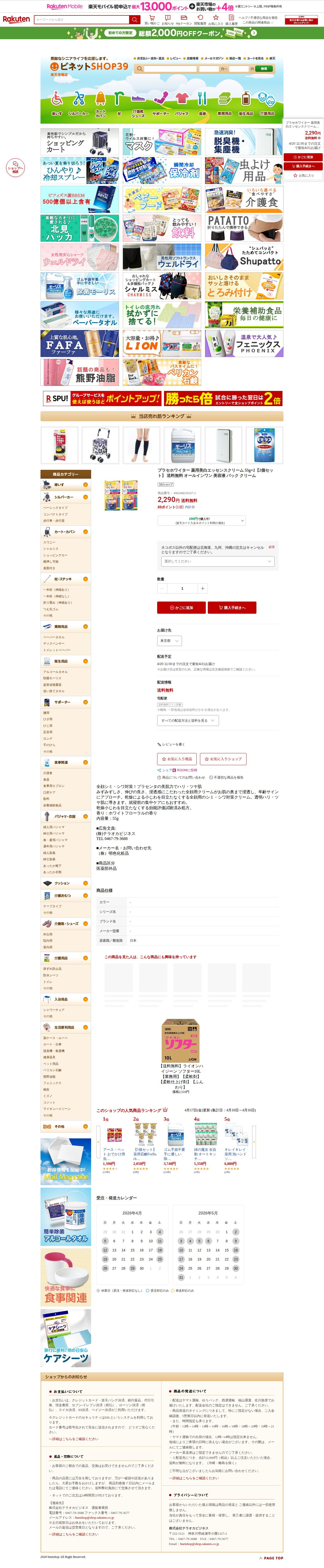 このページは、楽天市場で販売されているプラセホワイター薬用美白エッセンスクリーム55g×2個セットの商品ページです。価格は2,290円で送料無料。プラセンタ配合の全顔用クリームで、シミ・シワ対策とハリ・ツヤ肌を目指す製品。乾燥による小じわを目立たなくする効能評価試験済みで、ホワイトフローラルの香りが特徴。医薬部外品で、就寝前の集中ケアにも推奨。最短4月21日の配送予定。