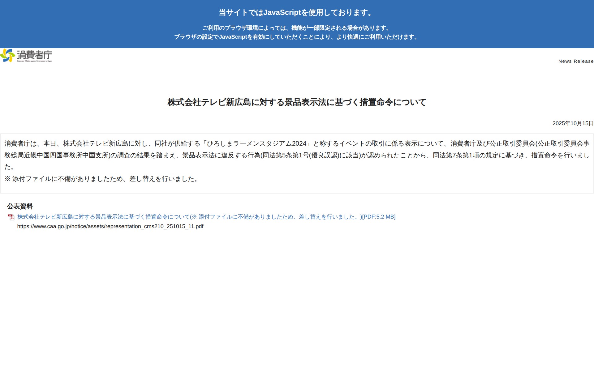 このページは、消費者庁が株式会社テレビ新広島に対して2025年10月15日に行った景品表示法に基づく措置命令について記載しています。同社が供給する「ひろしまラーメンスタジアム2024」というイベントの表示が、景品表示法第5条第1号の優良誤認に該当する違反行為であると判断されました。消費者庁および公正取引委員会の調査結果に基づき、景品表示法第7条第1項の規定に従って措置命令が発令されたもので、詳細は添付ファイルに記載されています。