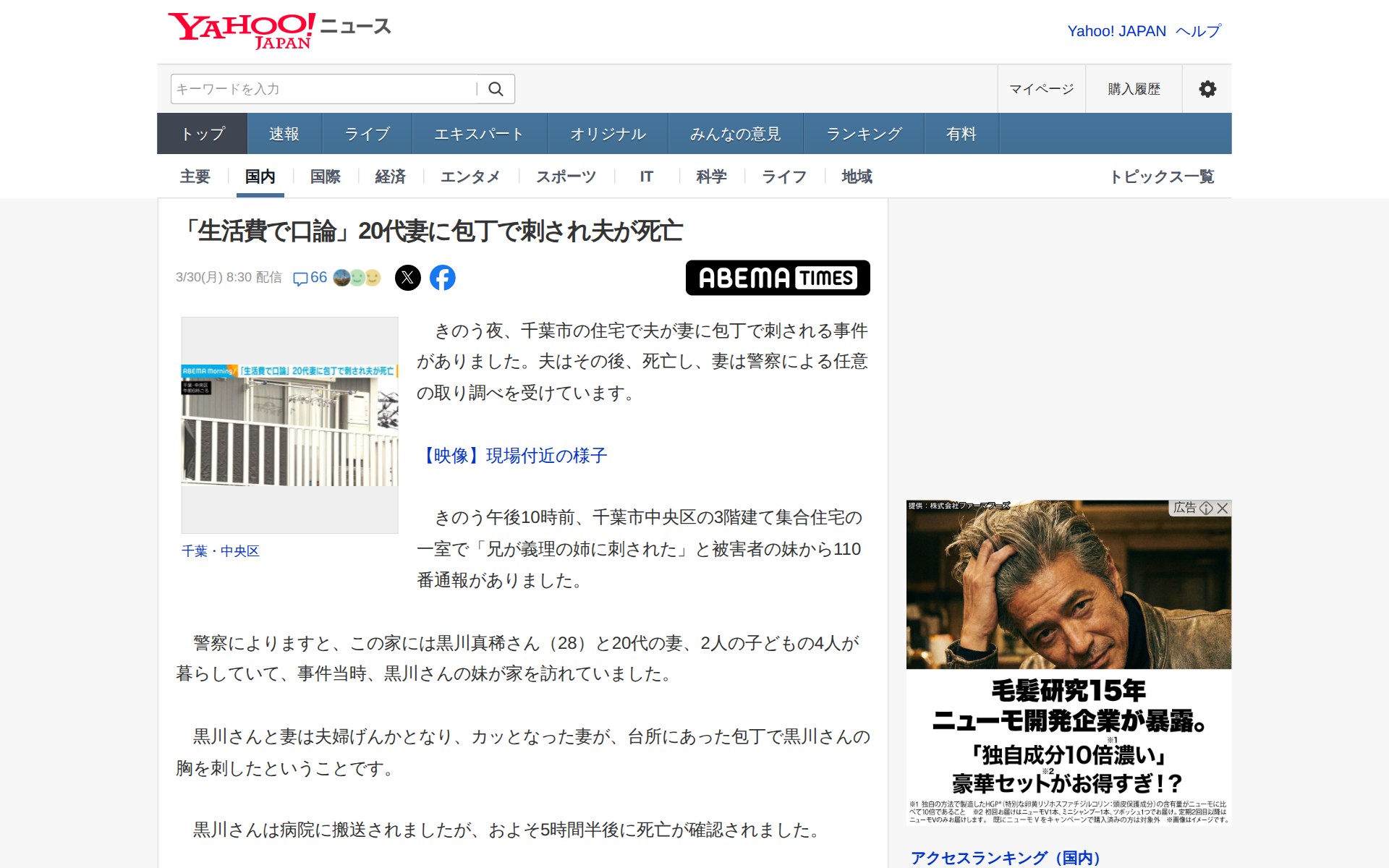 「生活費で口論」20代妻に包丁で刺され夫が死亡(ABEMA TIMES) - Yahoo!ニュース