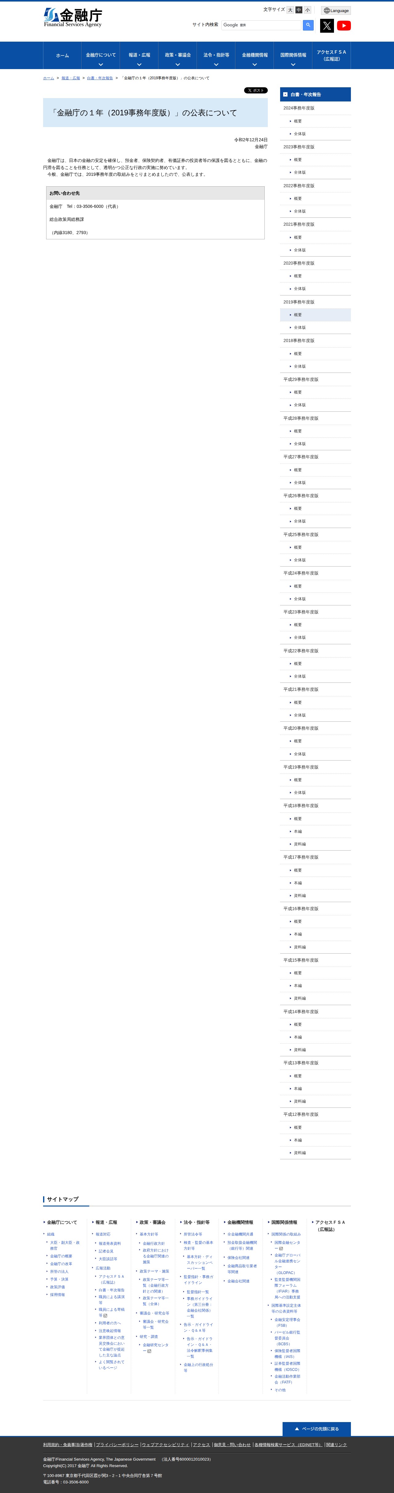 このページは、金融庁が2019事務年度(令和2年12月24日公表)の取組みをまとめた年次報告書の公表についての告知です。金融庁は日本の金融安定確保、預金者・保険契約者・投資者保護、金融円滑化を任務とし、透明かつ公正な行政実施に努めています。ページには2019年度版を含む過去の白書・年次報告書が複数掲載されており、各年度の概要版と全体版へのリンクが提供されています。