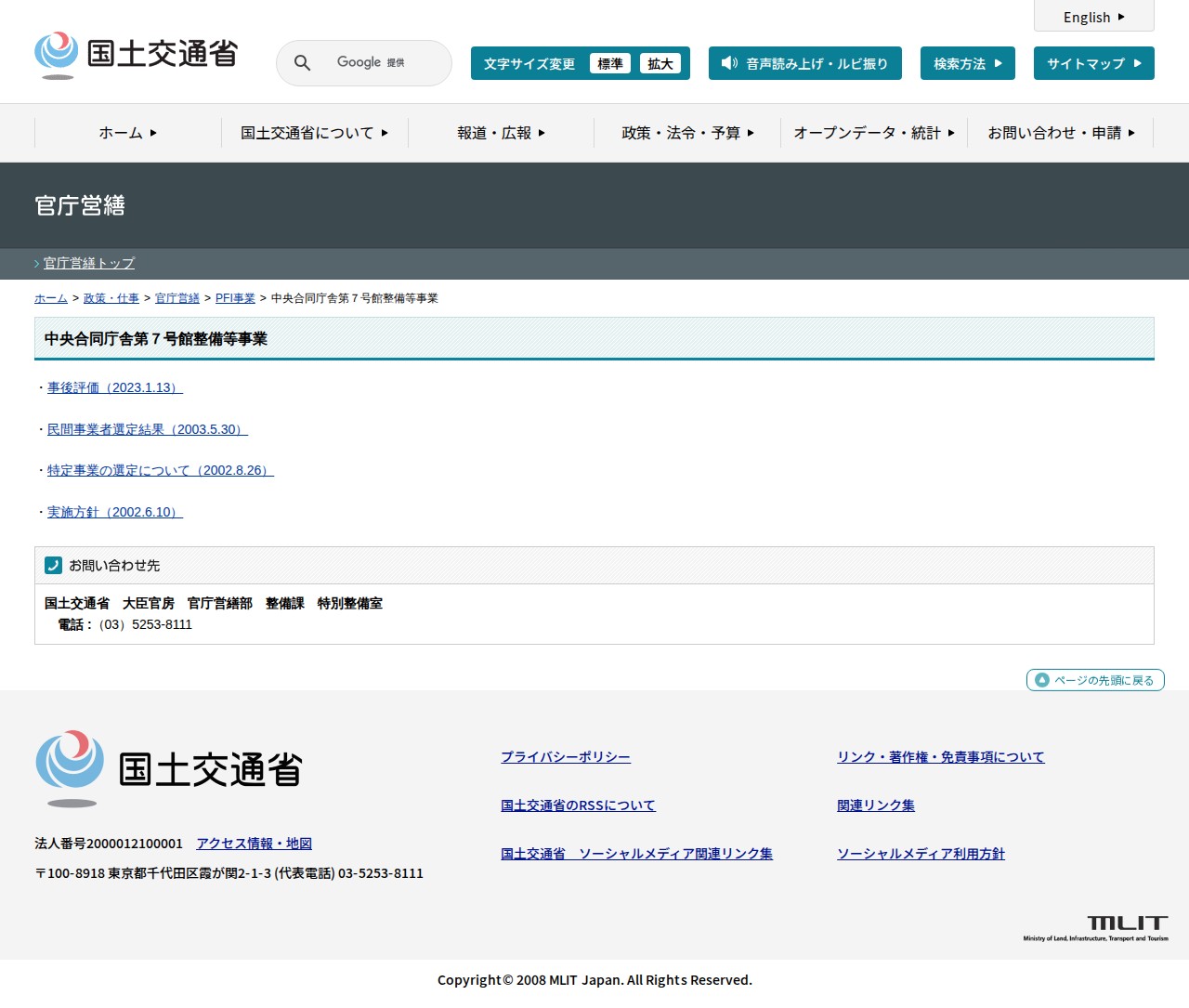このページは、国土交通省の官庁営繕部が管理する「中央合同庁舎第7号館整備等事業」に関するPFI事業の情報を提供しています。事業の実施方針(2002年6月)、特定事業の選定(2002年8月)、民間事業者選定結果(2003年5月)、および事後評価(2023年1月)の関連文書へのリンクが掲載されています。