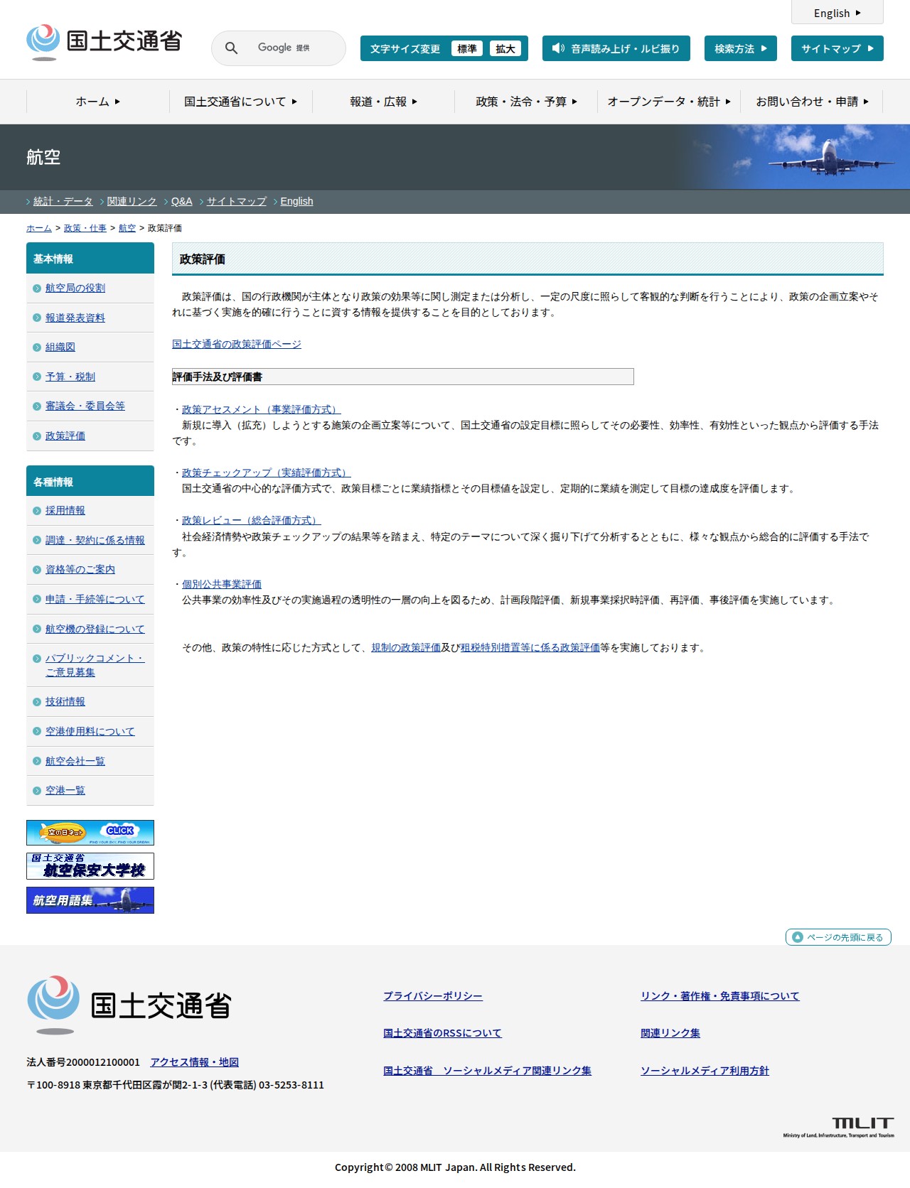 このページは、国土交通省航空局の政策評価に関する情報をまとめたものです。政策評価は、国の行政機関が政策の効果を測定・分析し、客観的な判断に基づいて政策立案と実施を適切に行うことを目的としています。政策アセスメント、政策チェックアップ、政策レビュー、個別公共事業評価といった複数の評価手法が紹介されており、政策の特性に応じて規制評価や租税特別措置評価なども実施されています。