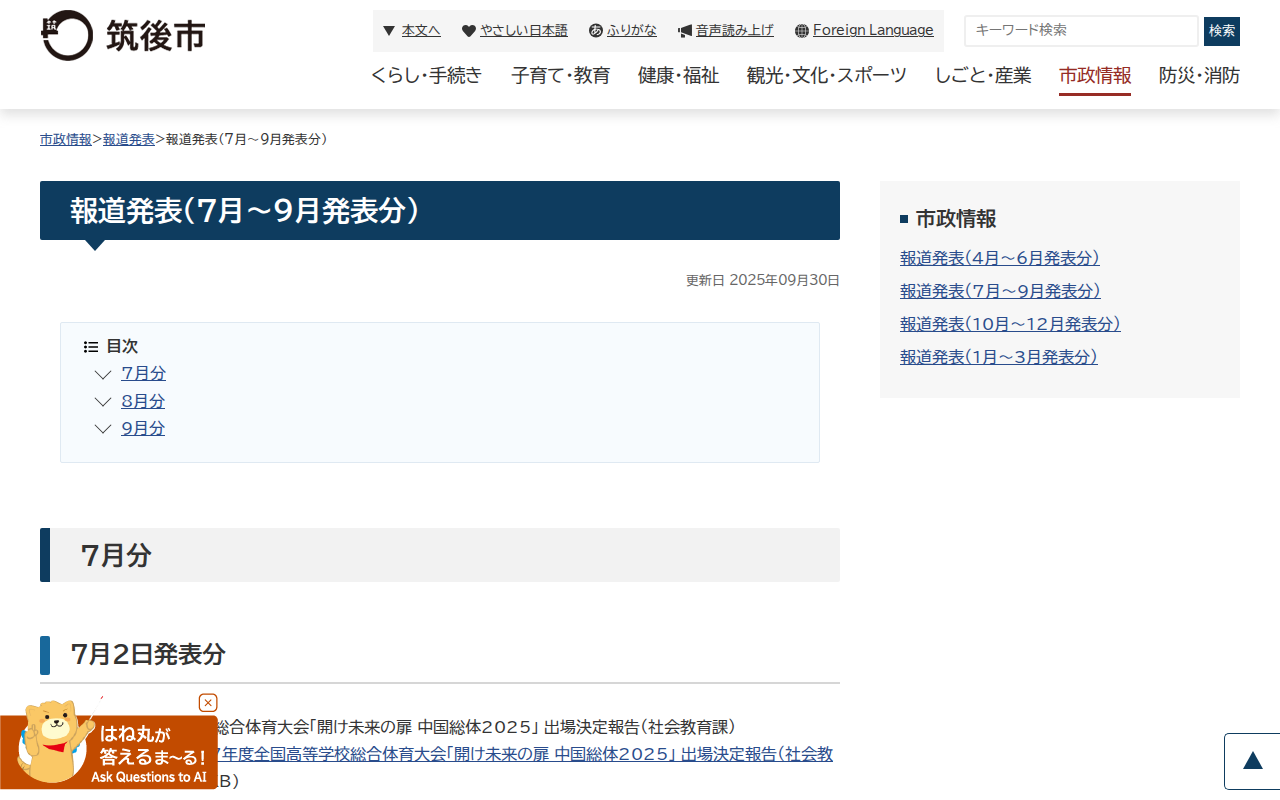 報道発表(7月〜9月発表分)|筑後市公式ホームページ - 保存されたスクリーンショット