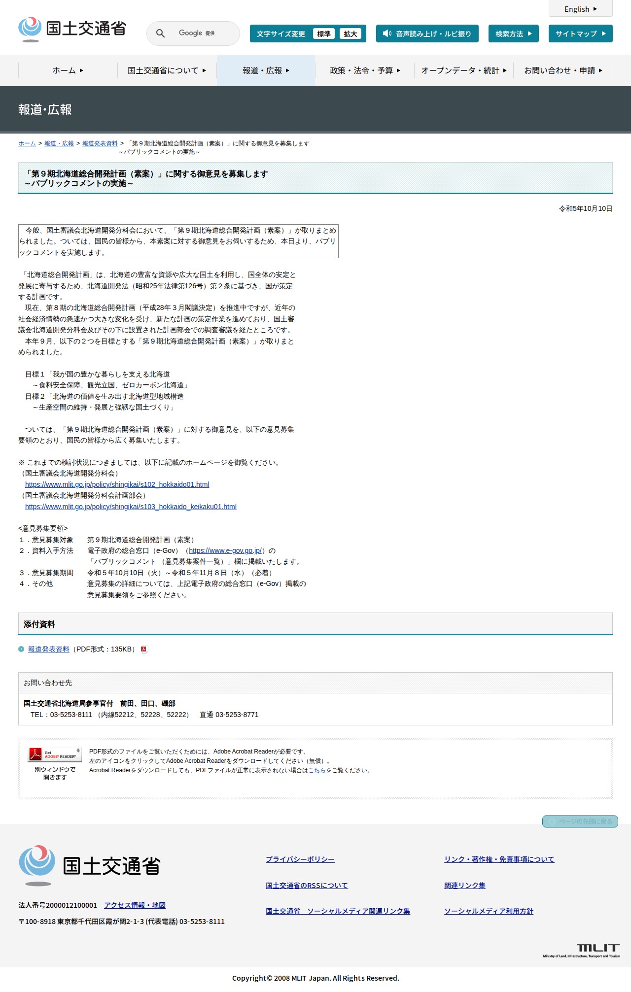 報道発表資料:「第9期北海道総合開発計画(素案)」に関する御意見を募集します <br>~パブリックコメントの実施~ - 国土交通省