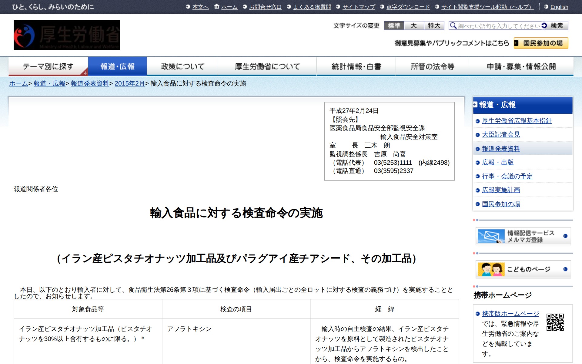 輸入食品に対する検査命令の実施 |報道発表資料|厚生労働省 - 保存されたスクリーンショット