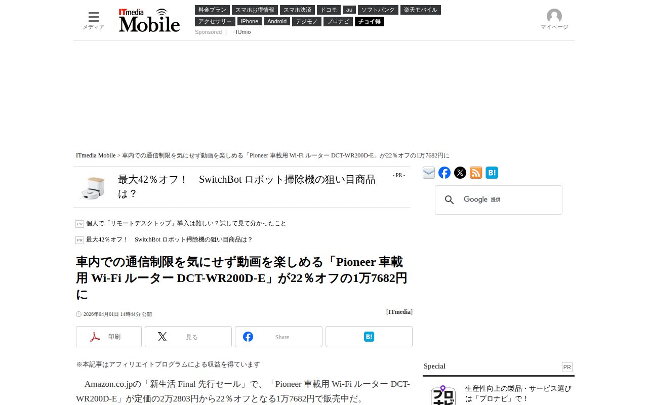車内での通信制限を気にせず動画を楽しめる「Pioneer 車載用 Wi-Fi ルーター DCT-WR200D-E」が22%オフの1万7682円に - ITmedia Mobile