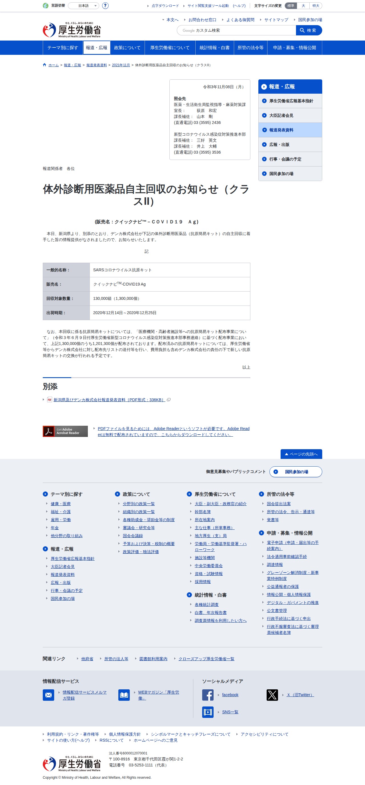 このページは、厚生労働省が2021年11月8日に発表した体外診断用医薬品の自主回収に関する報道資料である。デンカ株式会社が販売する「クイックナビ™-COVID19 Ag」(SARS-CoV-2抗原簡易キット)について、2020年12月14日~25日に出荷された130,000箱(130万個)の自主回収を開始したことを報告している。このうち120万個以上が医療機関や高齢者施設向けの配布事業で配布されており、デンカ株式会社の責任で新しいキットとの交換が予定されている。