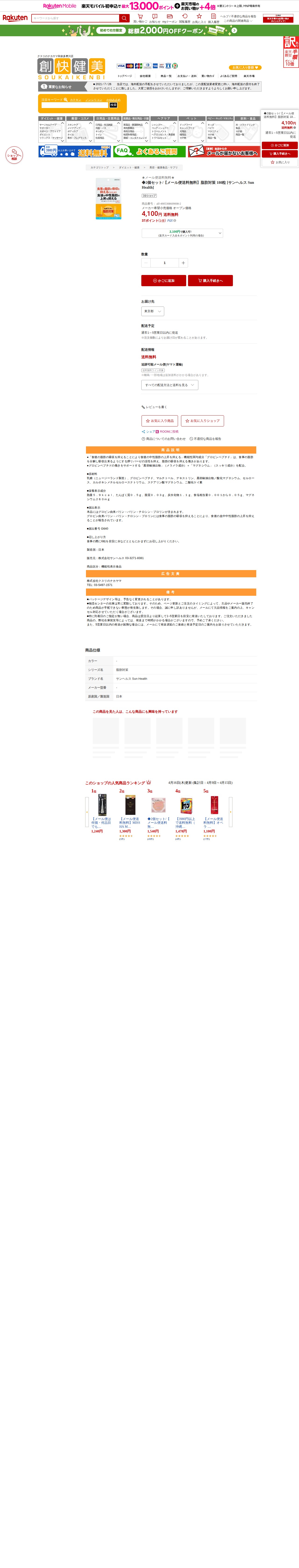 ![【楽天市場】◆2個セット/【メール便送料無料】脂肪対策 180粒 [サンヘルス Sun Health]:創快健美 - 保存されたスクリーンショット](https://pub-f6fa8ca7bebe4069bff3224f9a8f5334.r2.dev