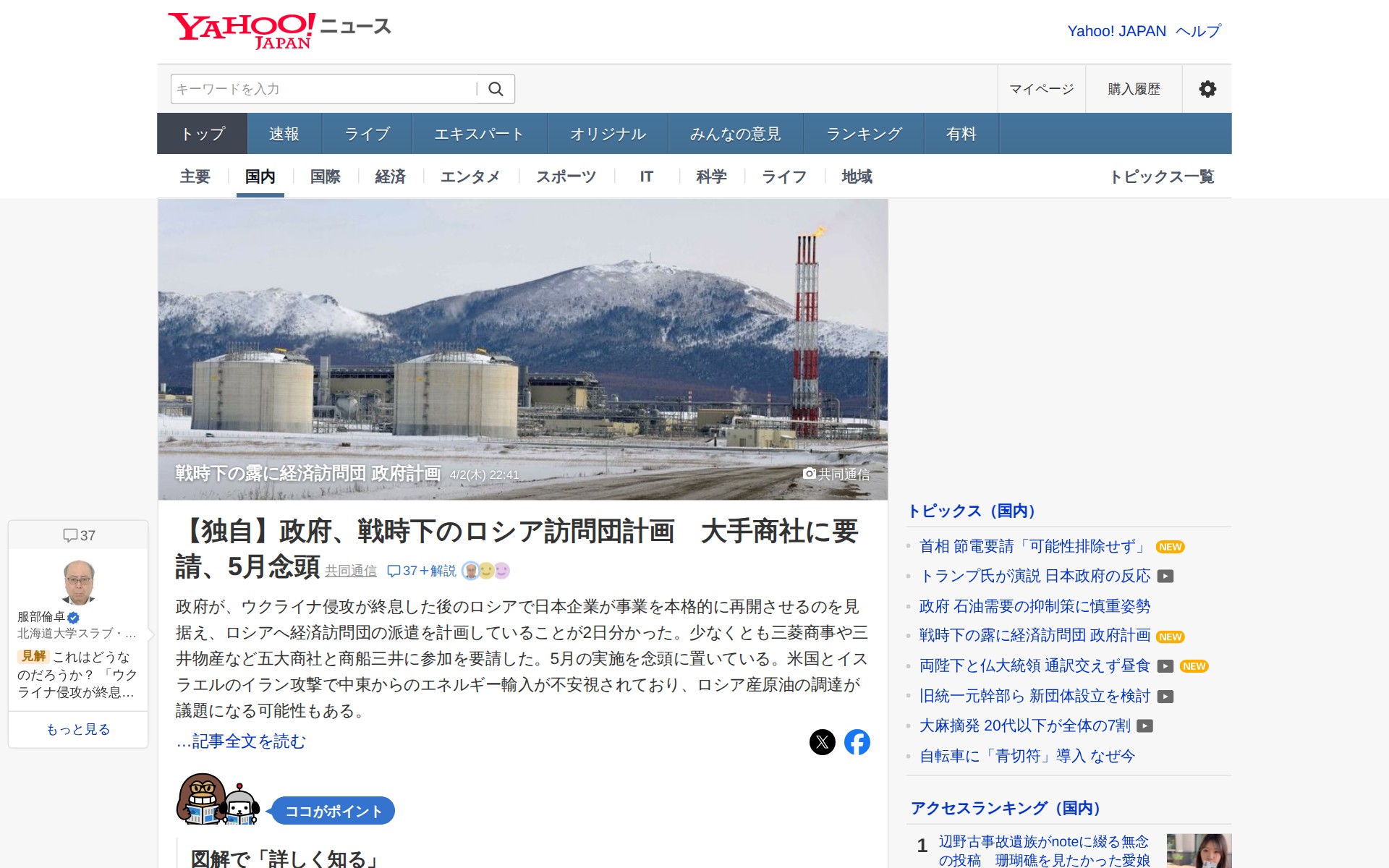 このページは、日本政府がウクライナ侵攻終息後のロシアでの日本企業の事業再開を見据え、経済訪問団の派遣を計画していることを報じている。三菱商事や三井物産など五大商社と商船三井に参加を要請し、5月の実施を念頭としている。米国とイスラエルのイラン攻撃により中東からのエネルギー輸入が不安視される中、ロシア産原油の調達が議題になる可能性も指摘されている。