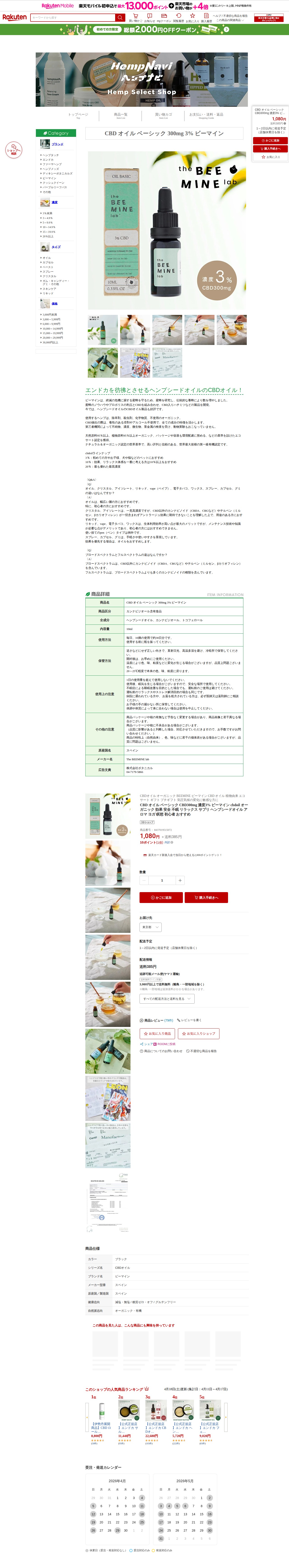 このページは、楽天市場で販売されているビーマインのCBDオイル「ベーシック」の商品ページです。CBD300mg、濃度3%で価格は1,080円。蜜蜂保護に取り組むビーマインが開発した製品で、オーガニックヘンプシードオイルを使用。除草剤や化学物質は不使用で、エコサート認定を取得。第三者機関による検査済みで、動物実験も行っていません。初心者向けの低濃度。10摘で約30日分。冷暗所保管推奨。使用後の眠気注意。