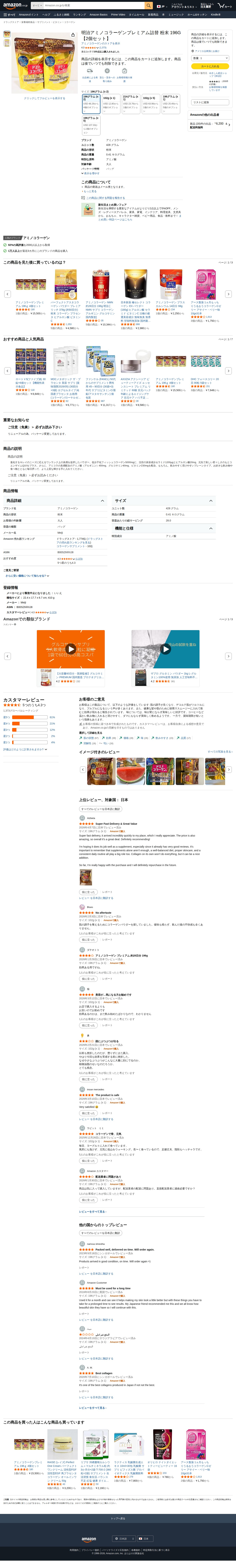 このページは、Amazonで販売されている明治アミノコラーゲンプレミアム詰替粉末196g2個セットの商品情報です。コラーゲンサプリメントであり、アミノ酸を特別な原料として含んでいます。価格は6,200円で、ゆきしん総合ショップが販売元です。4.3つ星の評価を受けており、過去1か月で100点以上購入されています。複数のサイズオプションが用意されており、メール便での発送となります。