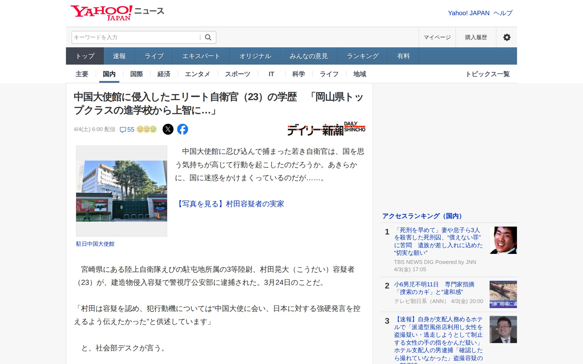 中国大使館に侵入したエリート自衛官(23)の学歴 「岡山県トップクラスの進学校から上智に…」(デイリー新潮) - Yahoo!ニュース