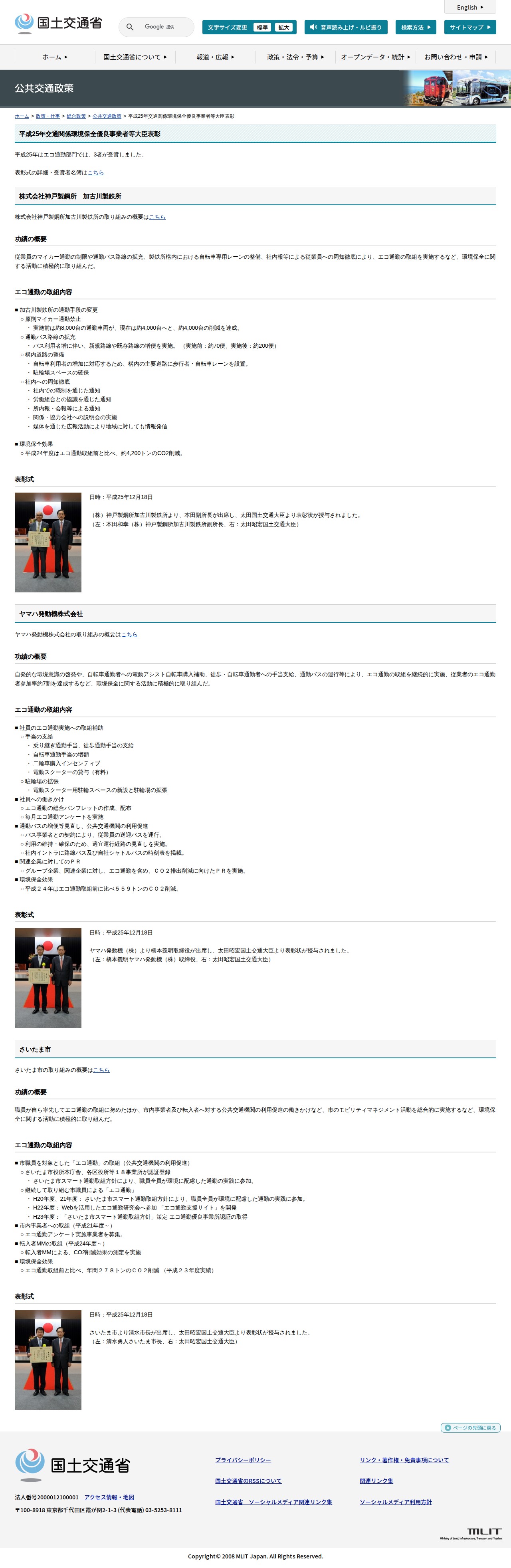 公共交通政策:平成25年交通関係環境保全優良事業者等大臣表彰 - 国土交通省 - 保存されたスクリーンショット