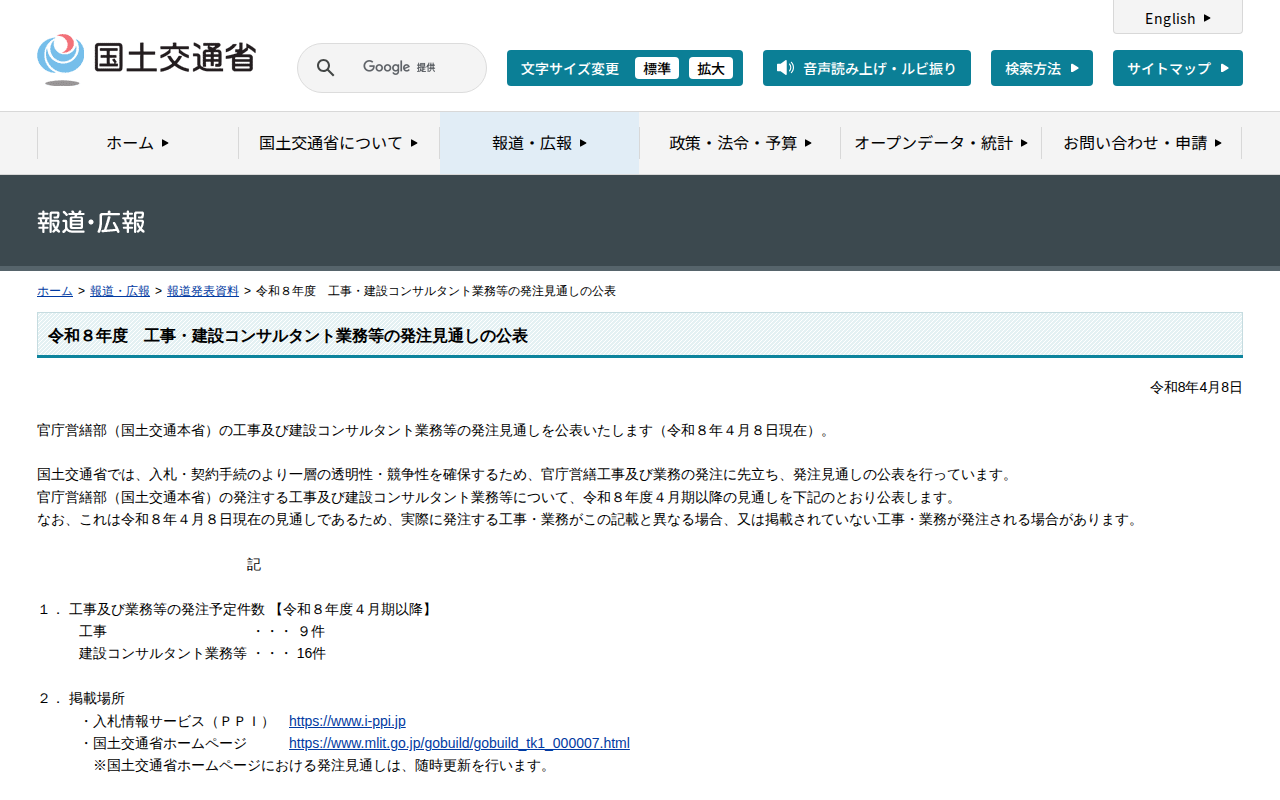 報道発表資料:令和8年度 工事・建設コンサルタント業務等の発注見通しの公表 - 国土交通省
