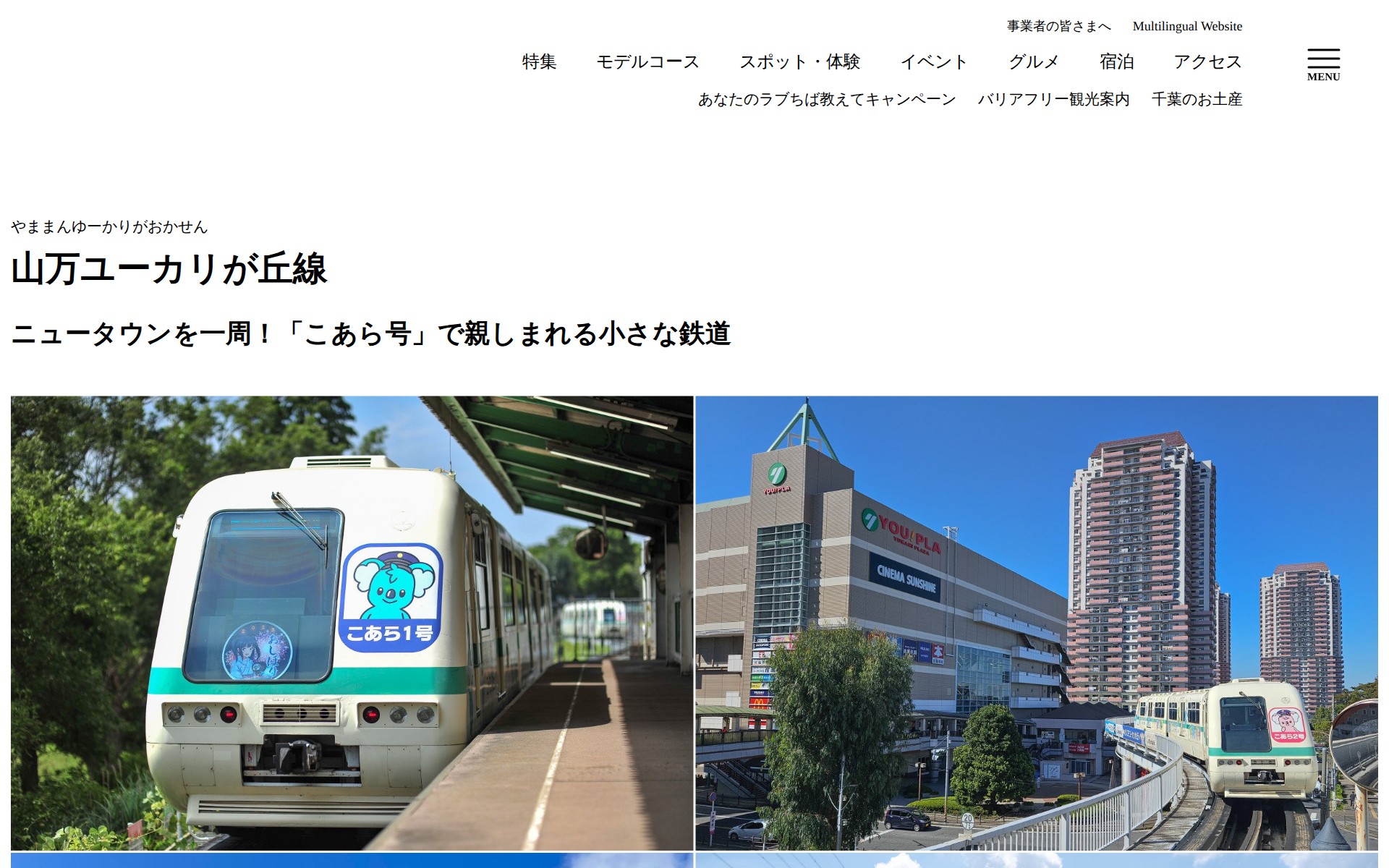 このページは、千葉県佐倉市のニュータウン・ユーカリが丘を走る小さな鉄道「山万ユーカリが丘線」を紹介しています。京成本線と接続するユーカリが丘駅を起点に、タウン内6駅を約14分で一周する路線です。「こあら号」の愛称で親しまれるレトロでかわいらしい車両が特徴。人にも環境にも優しい独自の新交通システムを採用しており、「公園駅」「女子大駅」など個性的な駅名でも有名です。周辺にはショッピングやグルメ、レジャー施設が充実しており、乗車料金は大人200円、1日乗車券は500円。