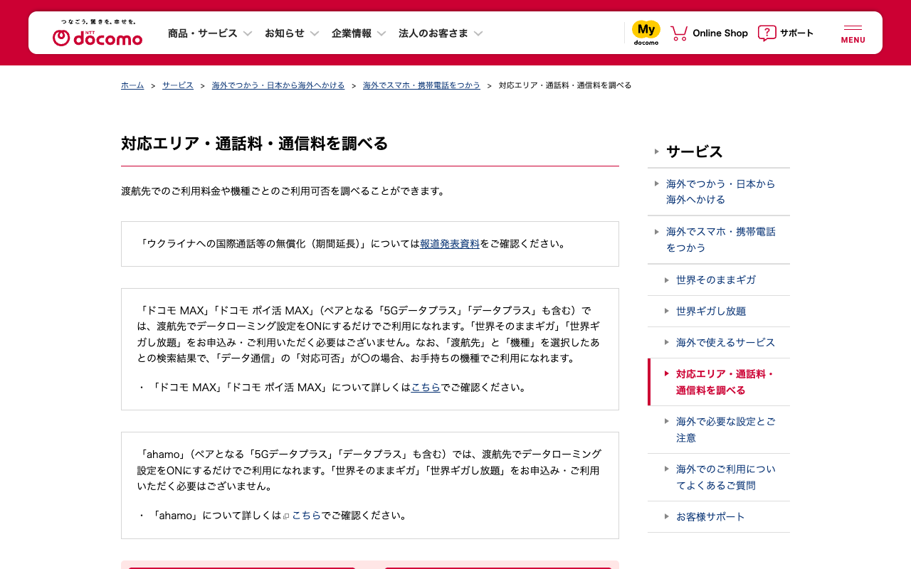 対応エリア・通話料・通信料を調べる | NTTドコモ - 保存されたスクリーンショット