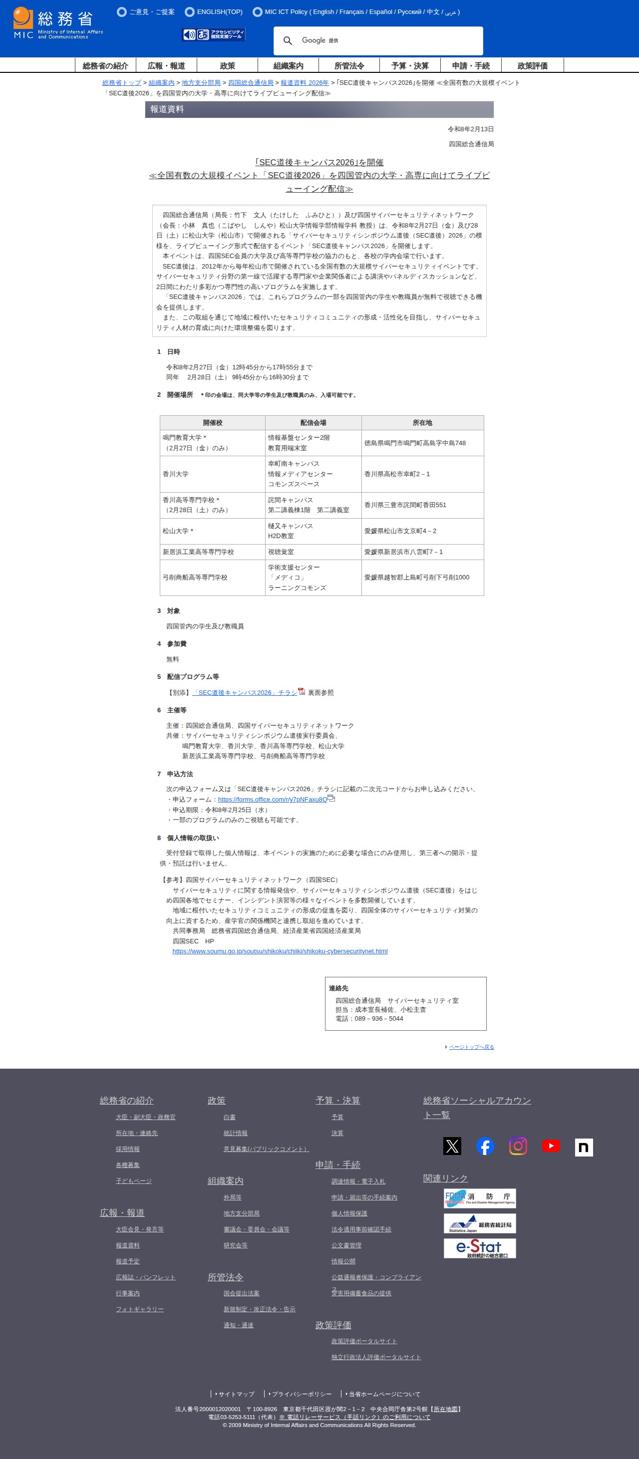 総務省|四国総合通信局|「SEC道後キャンパス2026」を開催 ≪全国有数の大規模イベント「SEC道後2026」を四国管内の大学・高専に向けてライブビューイング配信≫ - 保存されたスクリーンショット