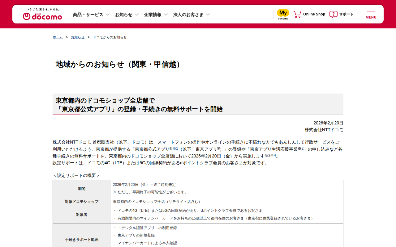 地域からのお知らせ:東京都内のドコモショップ全店舗で「東京都公式アプリ」の登録・手続きの無料サポートを開始 | お知らせ | NTTドコモ
