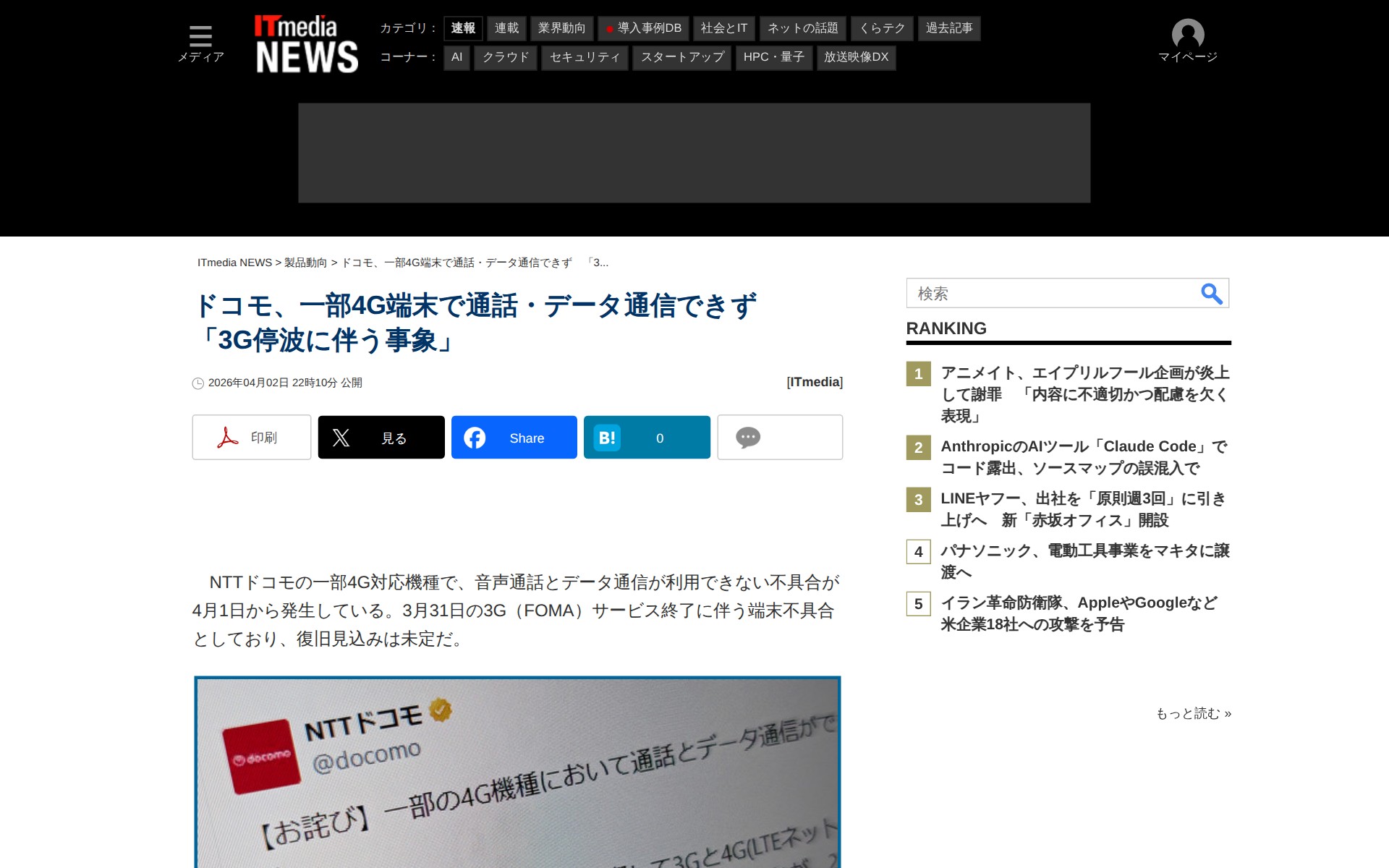 ドコモ、一部4G端末で通話・データ通信できず 「3G停波に伴う事象」 - ITmedia NEWS