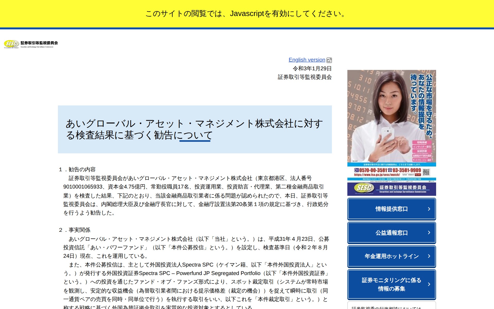 https://www.fsa.go.jp/sesc/news/c_2021/2021/20210129-1.html2026年4月6日 03:30 JST•アーカイブページ・viewer・ダウンロードは、この保存版を基準に表示されます。