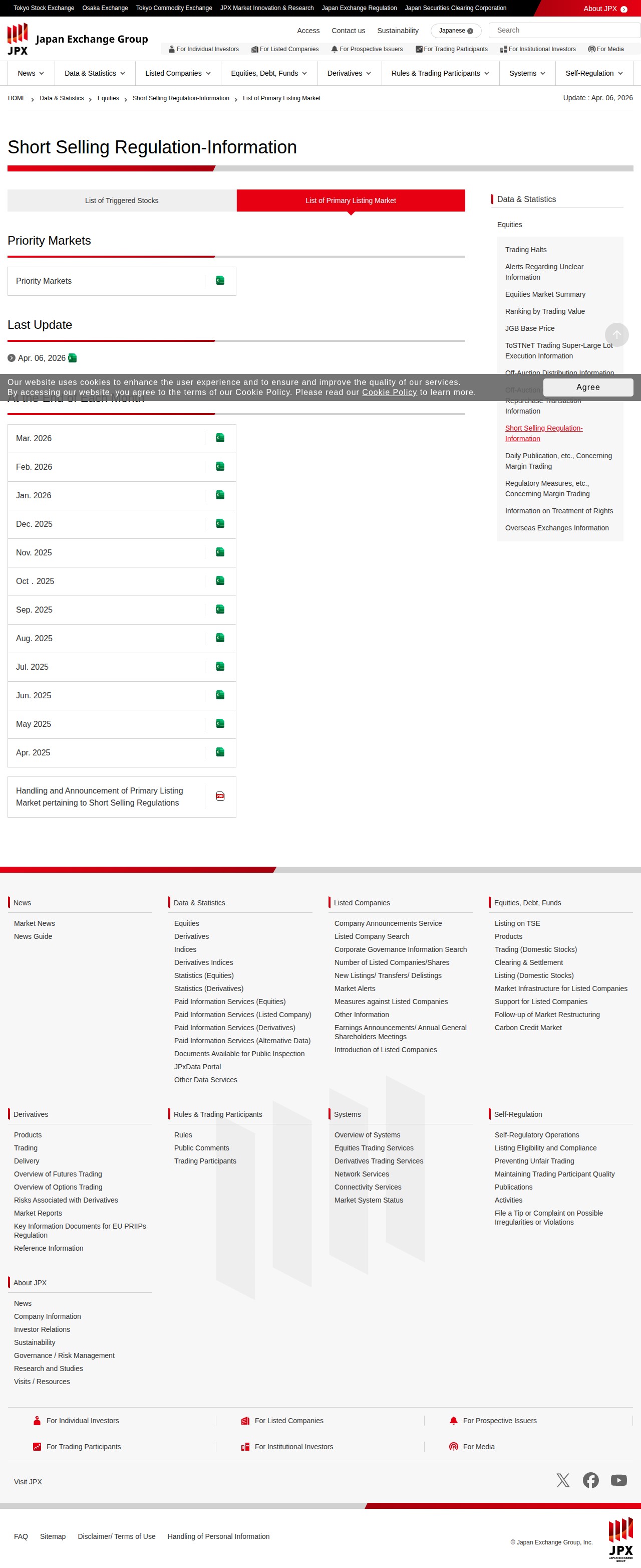 List of Primary Listing Market | Short Selling Regulation- Information | Japan Exchange Group