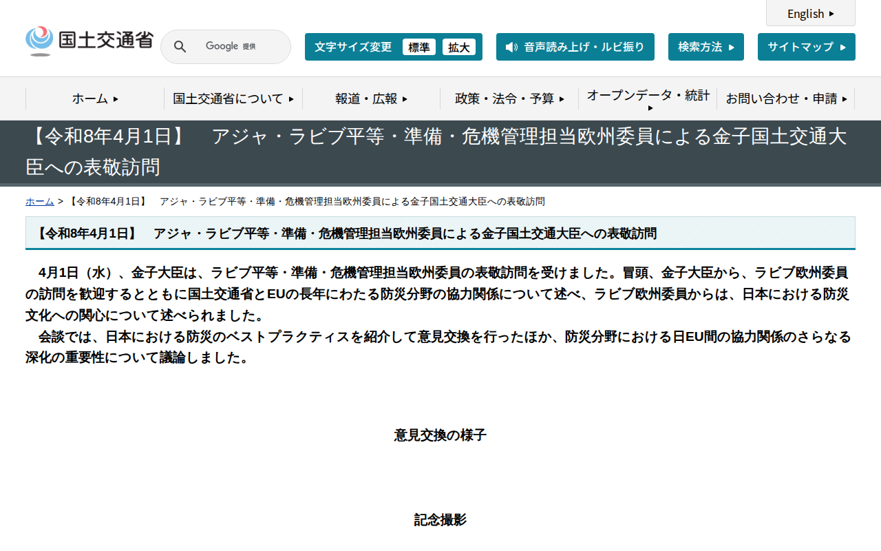 【令和8年4月1日】 アジャ・ラビブ平等・準備・危機管理担当欧州委員による金子国土交通大臣への表敬訪問 - 国土交通省