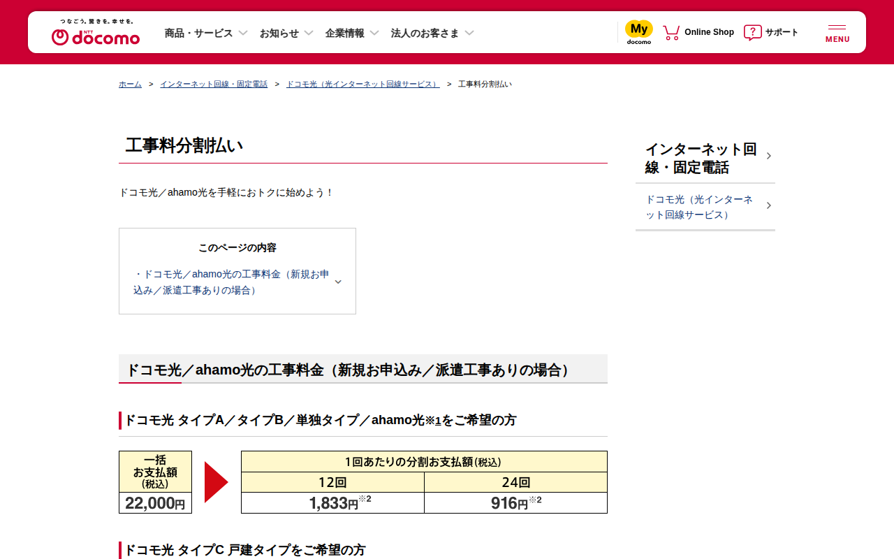 工事料分割払い | ドコモ光 | インターネット回線・固定電話 | NTTドコモ