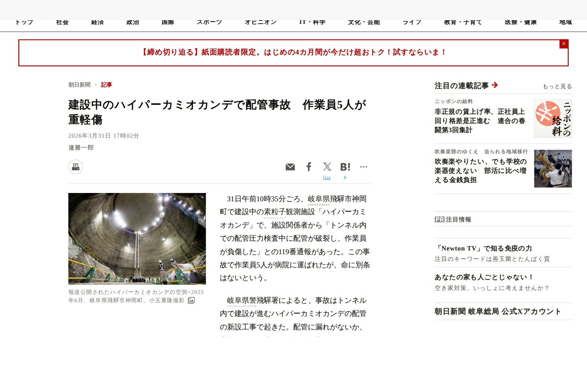 ![建設中のハイパーカミオカンデで配管事故 作業員5人が重軽傷 [岐阜県]:朝日新聞 - 保存されたスクリーンショット](https://pub-f6fa8ca7bebe4069bff3224f9a8f5334.r2.dev