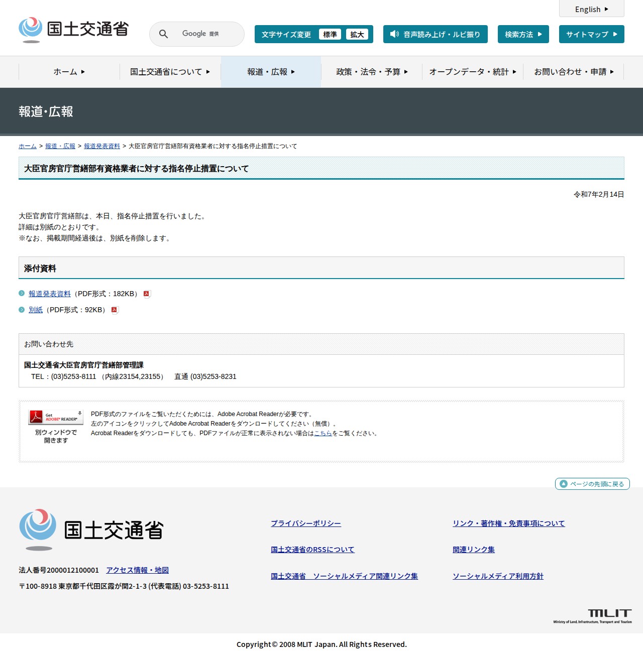 このページは、国土交通省大臣官房官庁営繕部が令和7年2月14日に実施した有資格業者に対する指名停止措置について発表する報道資料である。詳細は添付のPDFファイル(報道発表資料と別紙)に記載されている。お問い合わせは大臣官房官庁営繕部管理課まで。