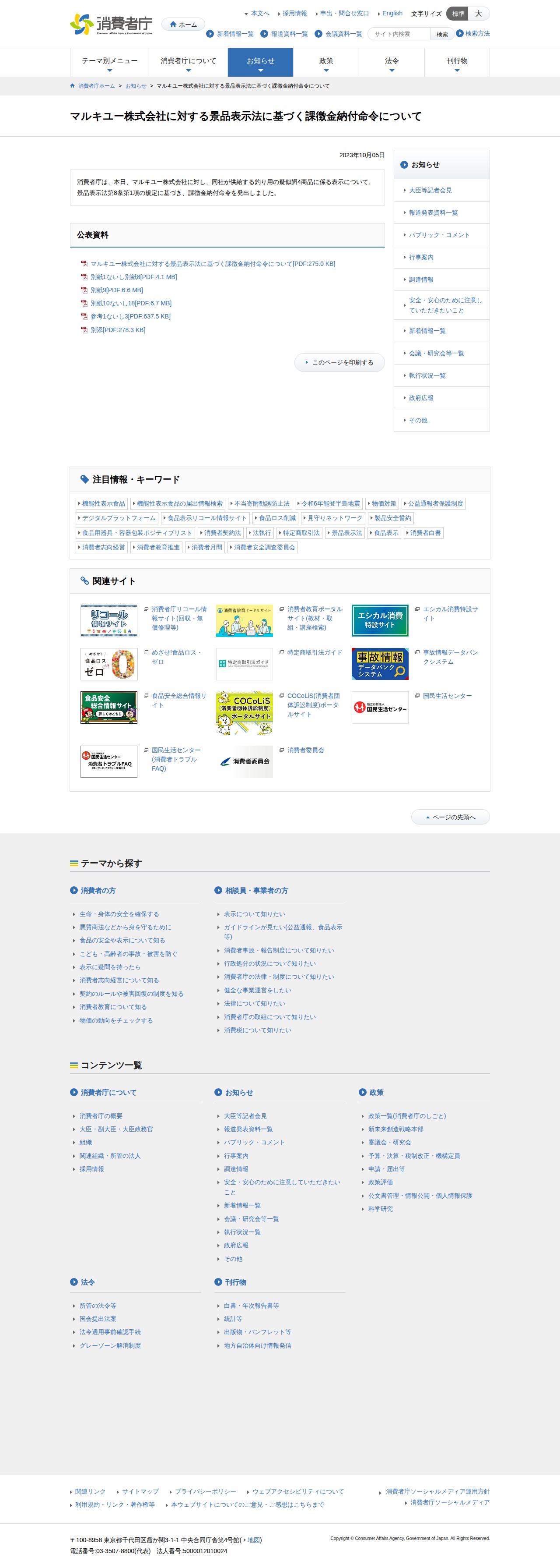 このページは、消費者庁がマルキユー株式会社に対して2023年10月5日に発出した景品表示法に基づく課徴金納付命令についての公表です。同社が供給する釣り用の疑似餌4商品の表示が景品表示法第8条第1項に違反していたため、課徴金納付命令が発令されました。詳細な資料として、命令書、別紙資料、参考資料などのPDFファイルが公開されています。