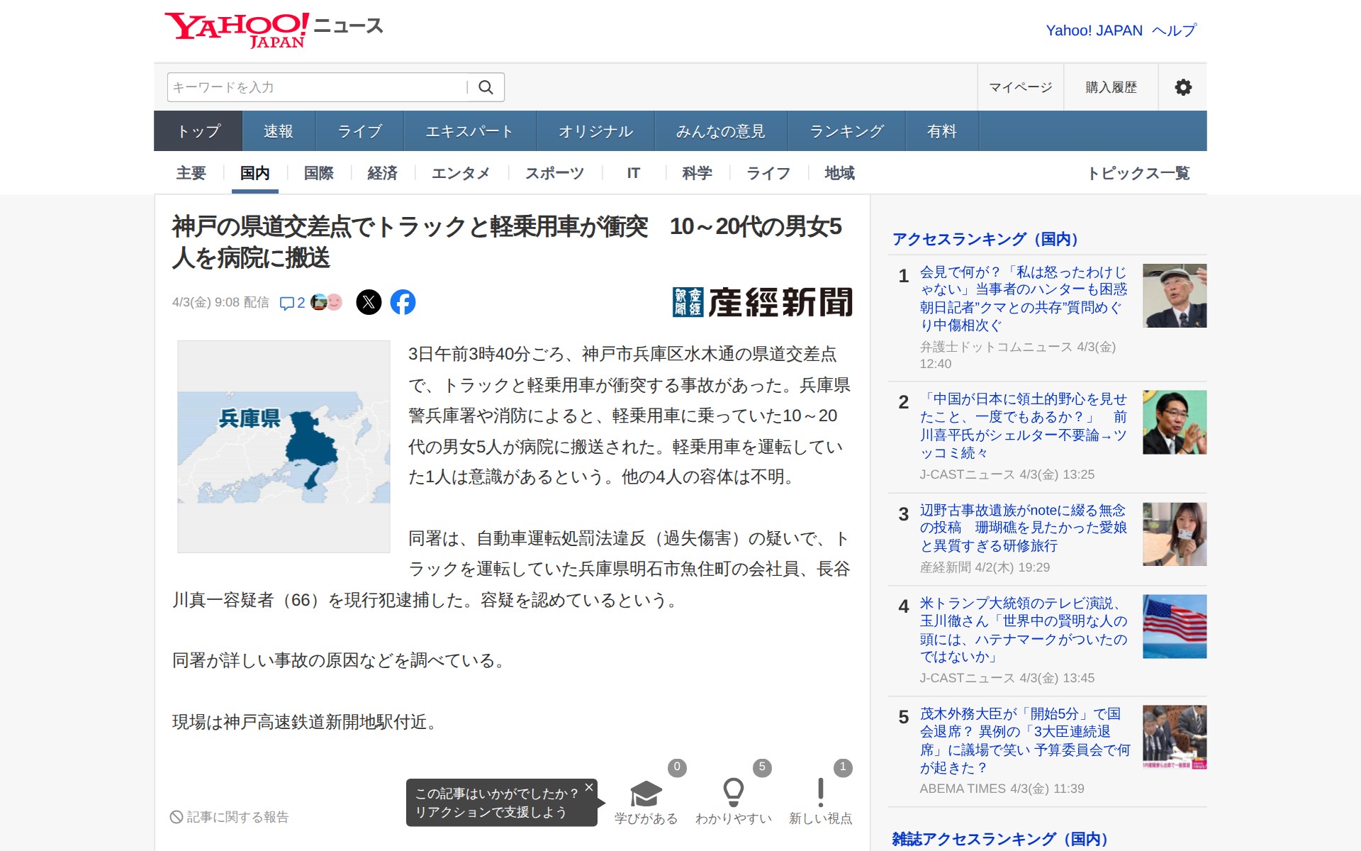 神戸の県道交差点でトラックと軽乗用車が衝突 10~20代の男女5人を病院に搬送(産経新聞) - Yahoo!ニュース - 保存されたスクリーンショット