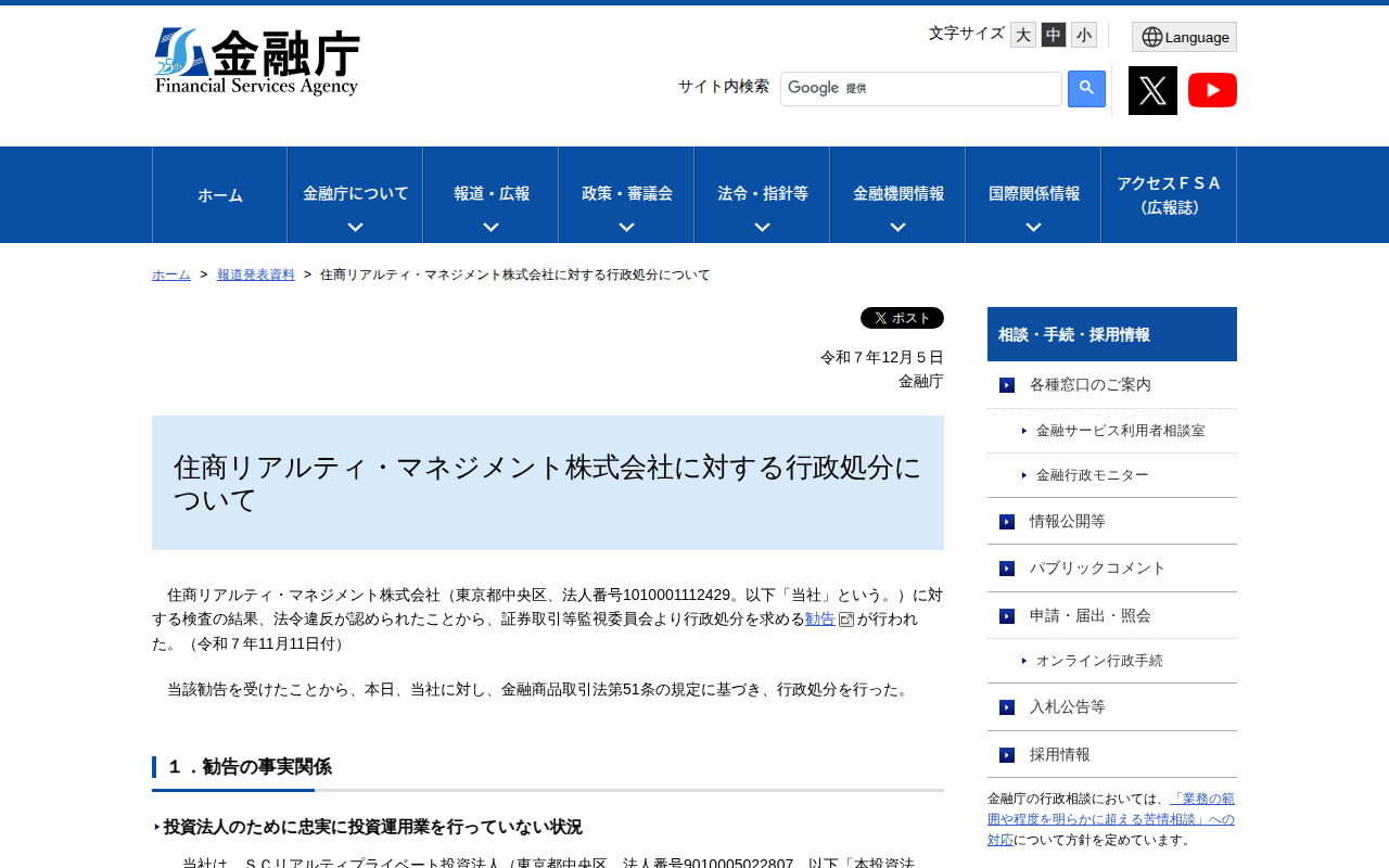 住商リアルティ・マネジメント株式会社に対する行政処分について:金融庁 - 保存されたスクリーンショット