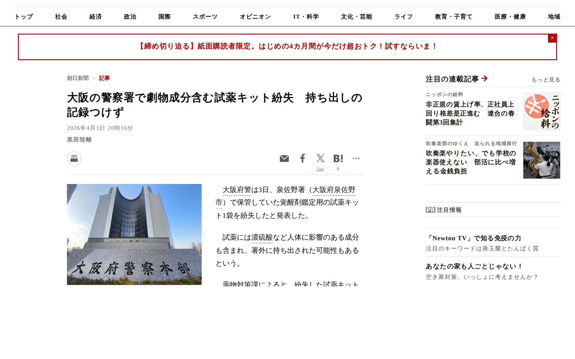 ![大阪の警察署で劇物成分含む試薬キット紛失 持ち出しの記録つけず [大阪府]:朝日新聞 - 保存されたスクリーンショット](https://pub-f6fa8ca7bebe4069bff3224f9a8f5334.r2.dev