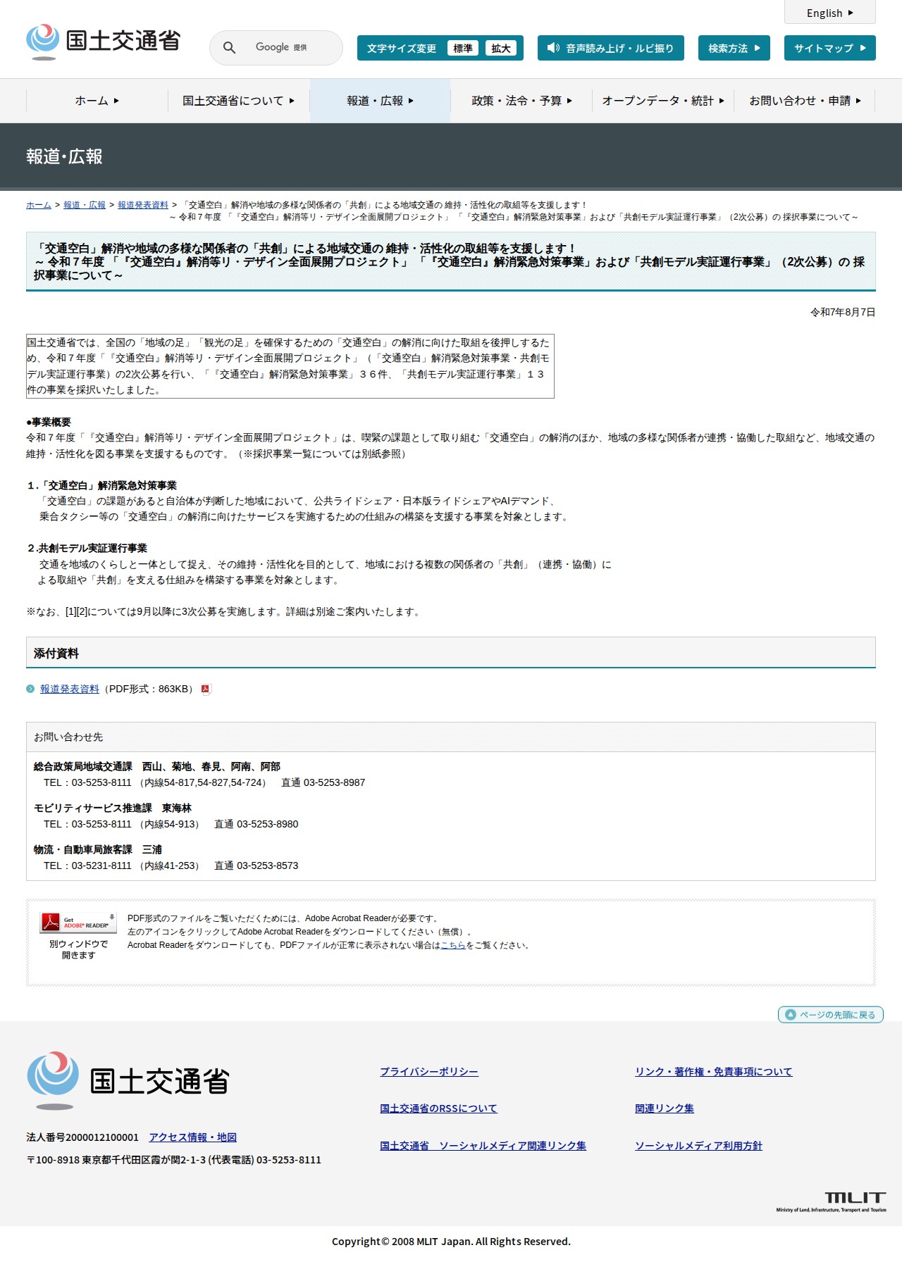 報道発表資料:「交通空白」解消や地域の多様な関係者の「共創」による地域交通の 維持・活性化の取組等を支援します!<br>~ 令和7年度 「『交通空白』解消等リ・デザイン全面展開プロジェクト」 「『交通空白』解消緊急対策事業」および「共創モデル実証運行事業」(2次公募)の 採択事業について~ - 国土交通省