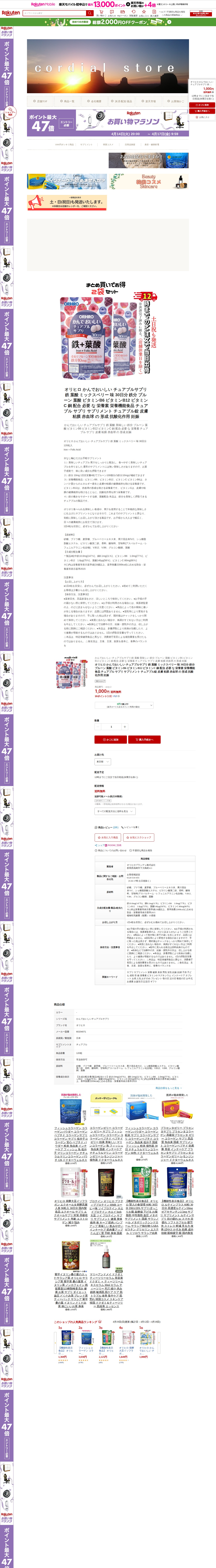 このページはオリヒロのチュアブルサプリメント(鉄・葉酸、ミックスベリー味、30日分)の商品紹介です。1日4粒で鉄分10mg(プルーン100個分)、葉酸、ビタミンB6・B12・C、銅を補給できます。水なしで噛んで食べられ、果汁配合で美味しく、栄養機能食品として皮膚・粘膜の健康維持や赤血球形成をサポートします。価格は1,000円で送料無料、12時までの注文で当日発送。子どもから大人まで利用でき、妊娠中の方は医師への相談を推奨しています。
