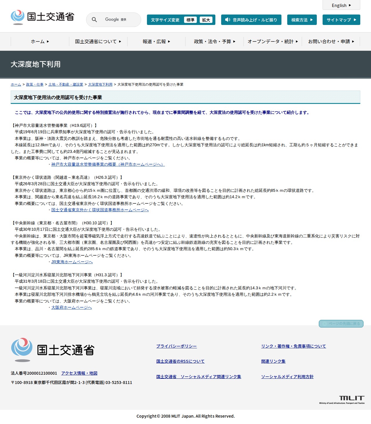 大深度地下利用:大深度地下使用法の使用認可を受けた事業 - 国土交通省 - 保存されたスクリーンショット