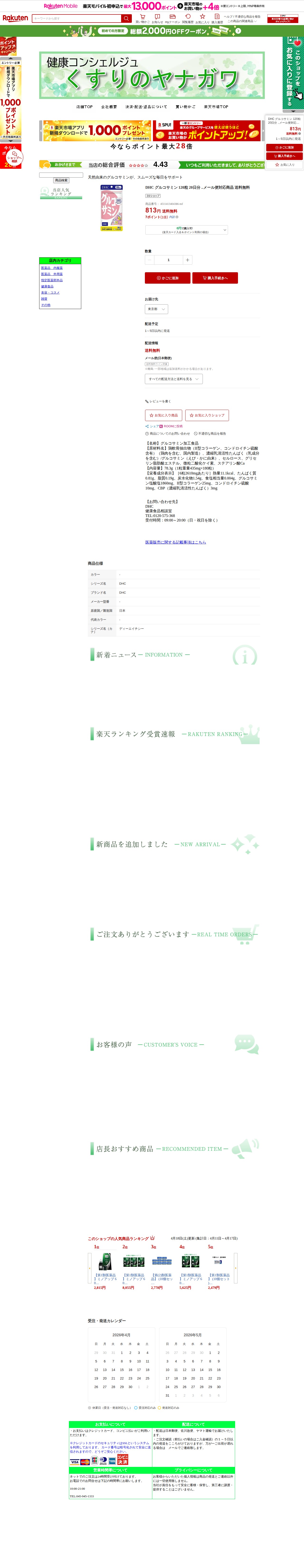 【楽天市場】DHC グルコサミン 120粒 20日分 ..メール便対応商品 送料無料:くすりのヤナガワ - 保存されたスクリーンショット
