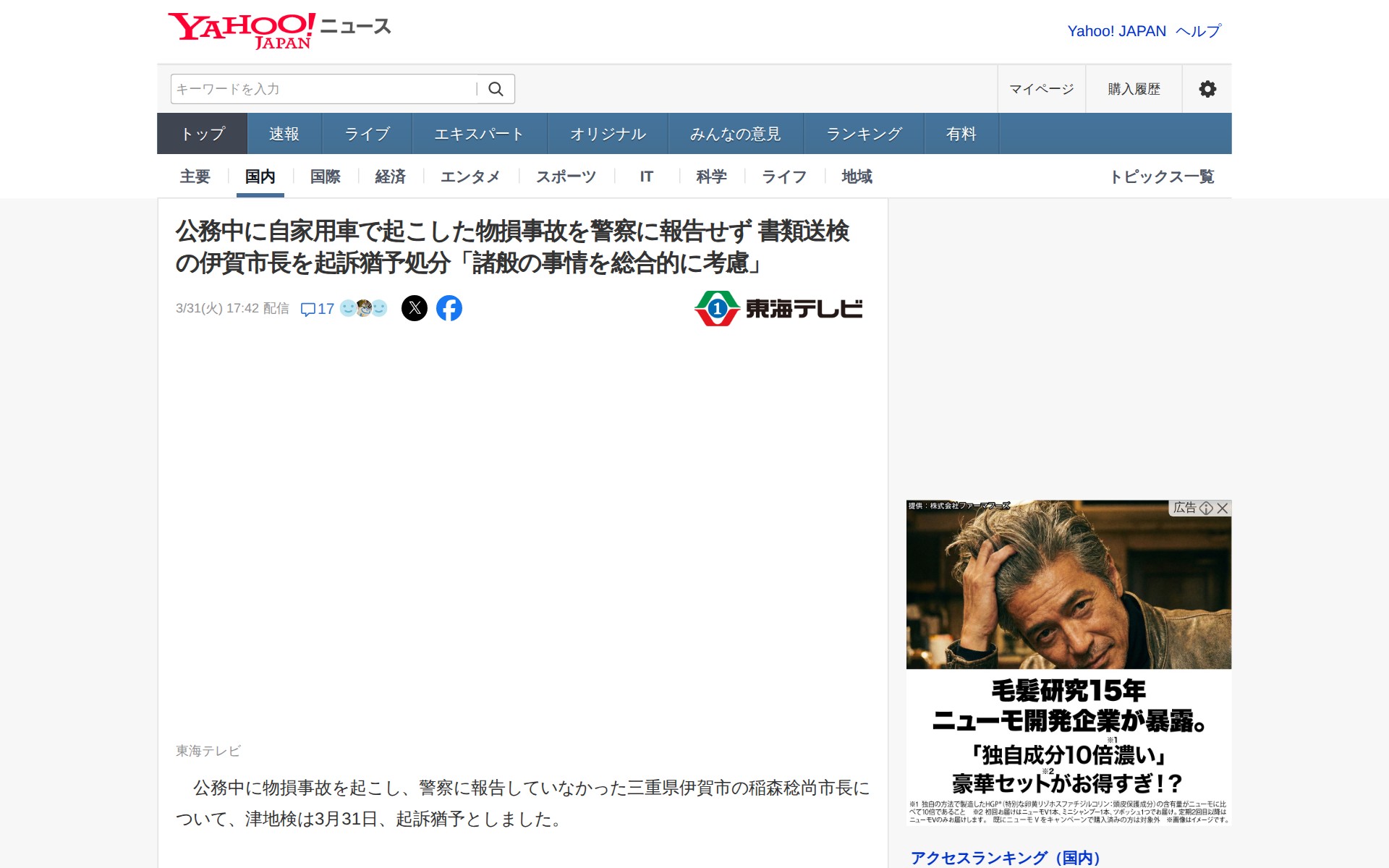 公務中に自家用車で起こした物損事故を警察に報告せず 書類送検の伊賀市長を起訴猶予処分「諸般の事情を総合的に考慮」(東海テレビ) - Yahoo!ニュース