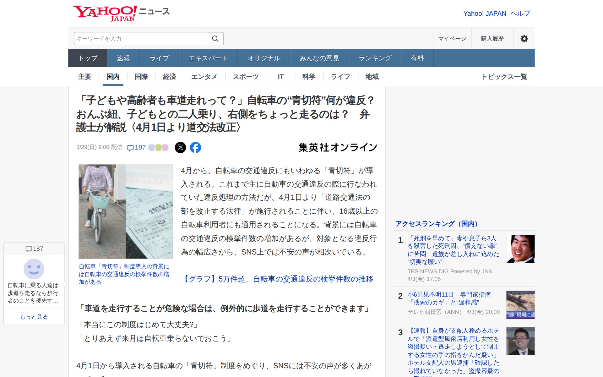 「子どもや高齢者も車道走れって?」自転車の“青切符”何が違反? おんぶ紐、子どもとの二人乗り、右側をちょっと走るのは? 弁護士が解説〈4月1日より道交法改正〉(集英社オンライン) - Yahoo!ニュース - 保存されたスクリーンショット