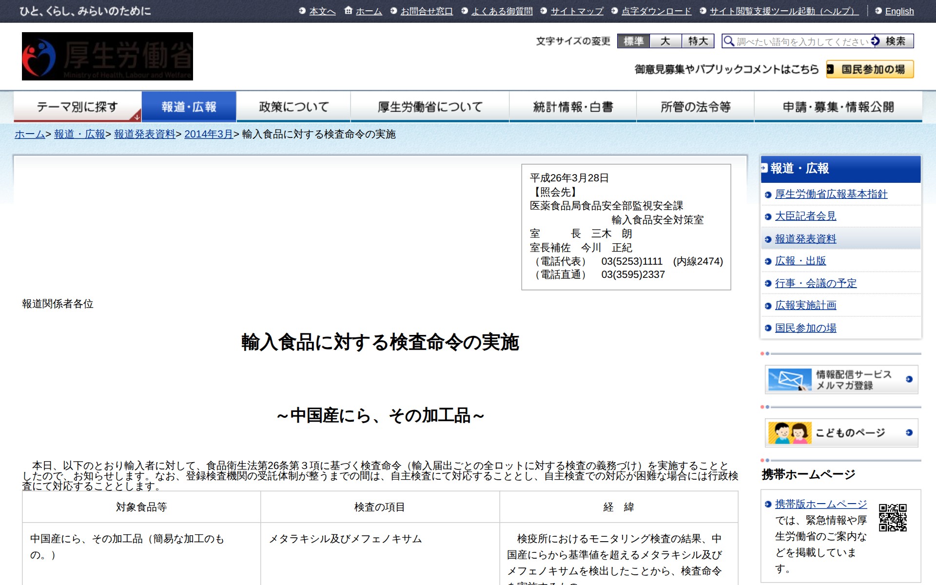 このページは、厚生労働省が2014年3月28日に発表した輸入食品検査命令に関する資料である。中国産にら及びその加工品から基準値を超える農薬メタラキシル及びメフェノキサムが検出されたため、食品衛生法に基づく検査命令を実施することを発表している。対象は2件の冷凍にら輸入品で、それぞれ基準値0.01ppmに対し0.05ppm及び0.02ppmが検出された。これらの農薬は殺菌剤であり、許容一日摂取量内での健康被害はないとされている。検査体制整備までは自主検査で対応予定。