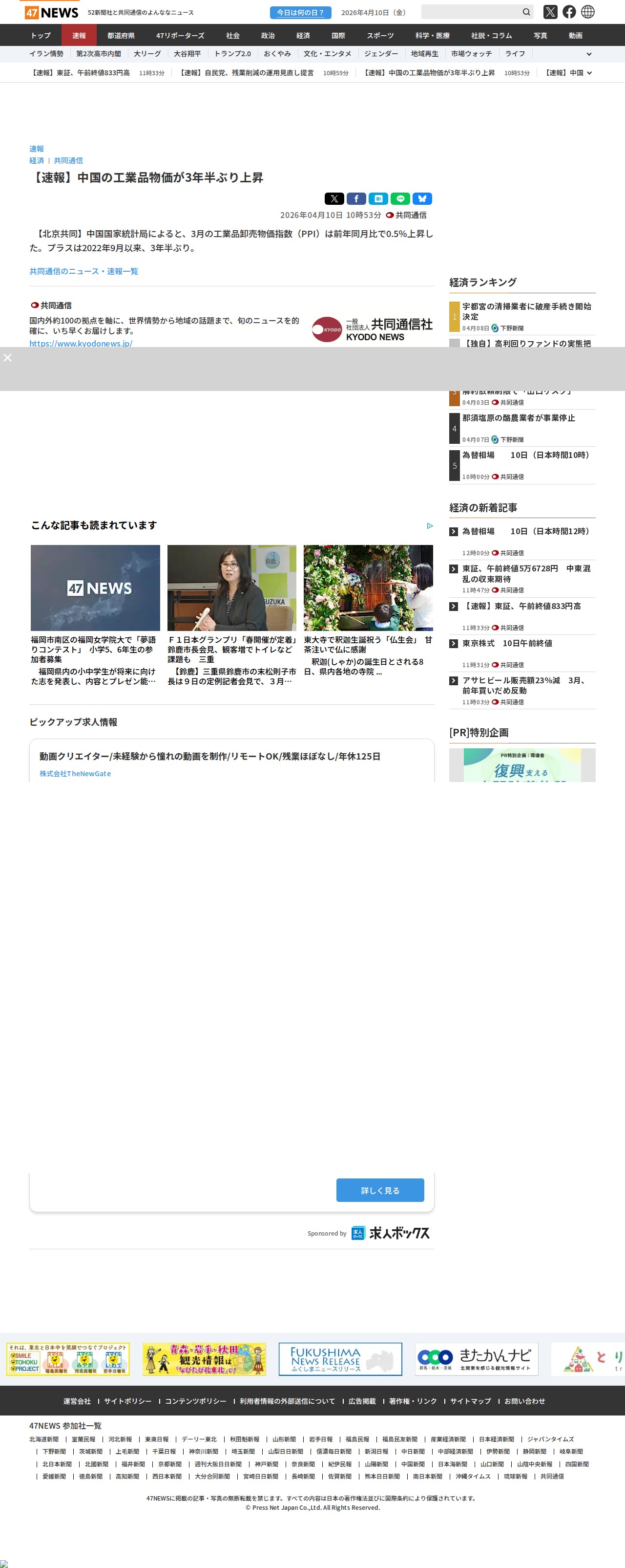 このページは、中国の3月の工業品卸売物価指数(PPI)が前年同月比で0.5%上昇したことを報じた速報記事です。プラスの上昇は2022年9月以来、3年半ぶりのことであり、中国の経済動向を示す重要な指標となっています。記事は共同通信による北京発の報道で、中国国家統計局の公式発表に基づいています。