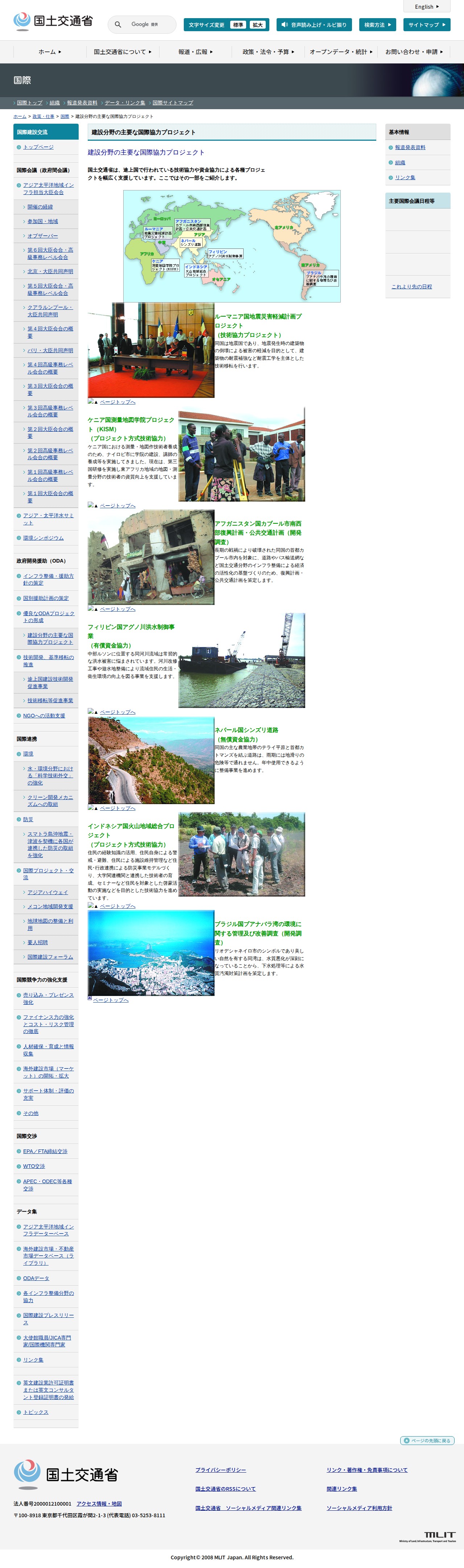このページは、国土交通省が途上国で実施している建設分野の主要な国際協力プロジェクトを紹介しています。ルーマニアの地震災害軽減、ケニアの測量地図学院、アフガニスタン・カブール市の復興計画、フィリピンのアグノ川洪水制御、ネパールのシンズリ道路、インドネシアの火山地域防災、ブラジルのブアナバラ湾環境改善など、技術協力や資金協力による様々なプロジェクトを支援しています。また、国際会議やインフラ整備支援方針の策定、ODA事業、技術移転推進などの国際建設交流活動も展開しています。
