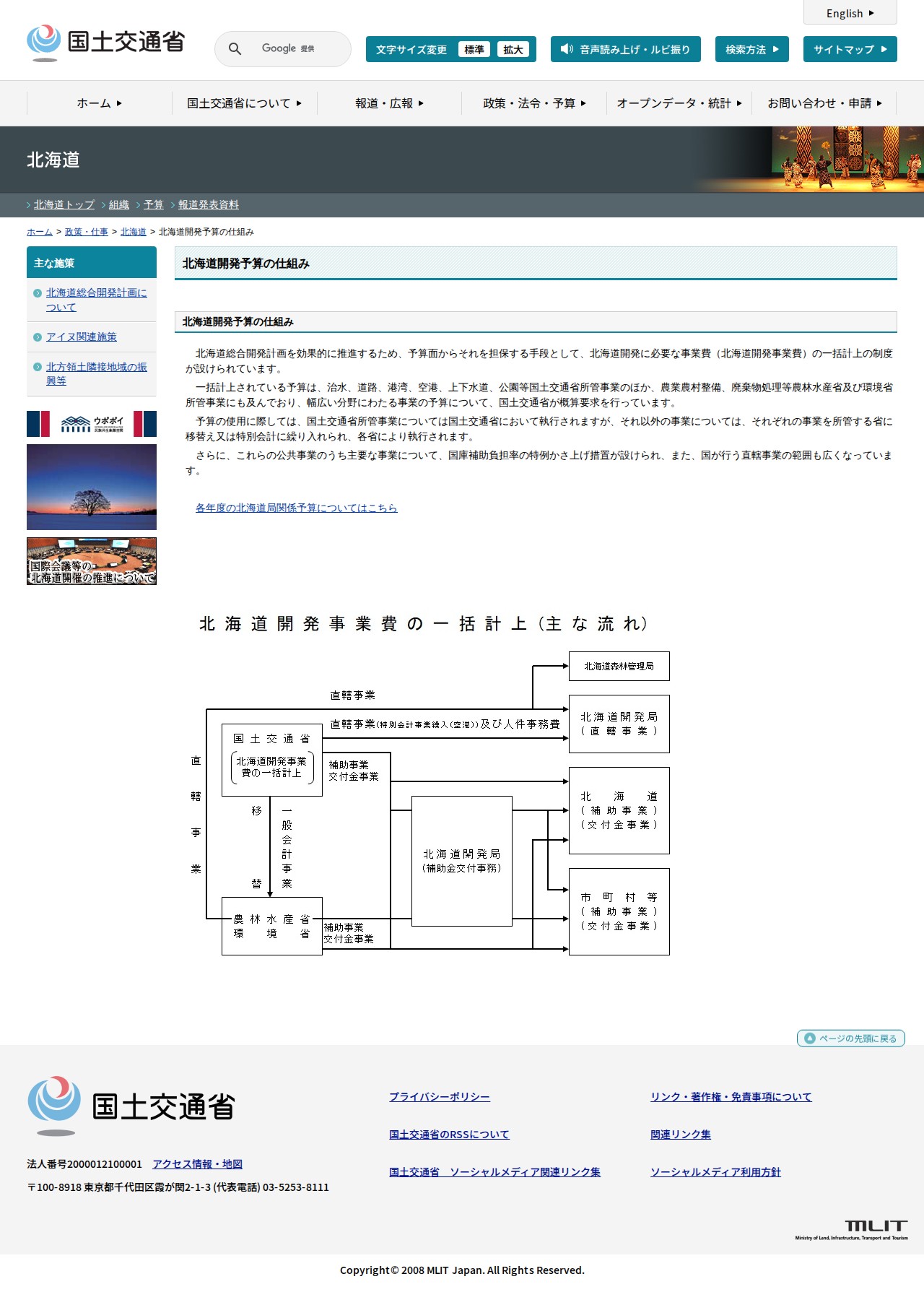 このページは、北海道開発予算の仕組みについて説明しています。北海道総合開発計画を推進するため、北海道開発事業費を一括計上する制度が設けられています。予算は治水、道路、港湾、空港、上下水道、公園などの国土交通省所管事業のほか、農業農村整備、廃棄物処理などの農林水産省・環境省所管事業にも及んでいます。国土交通省が概算要求を行い、所管する事業については国土交通省が執行し、その他の事業は各省に移替えまたは特別会計に繰り入れられて各省が執行します。さらに、主要事業については国庫補助負担率の特例かさ上げ措置と、直轄事業範囲の拡大が設けられています。