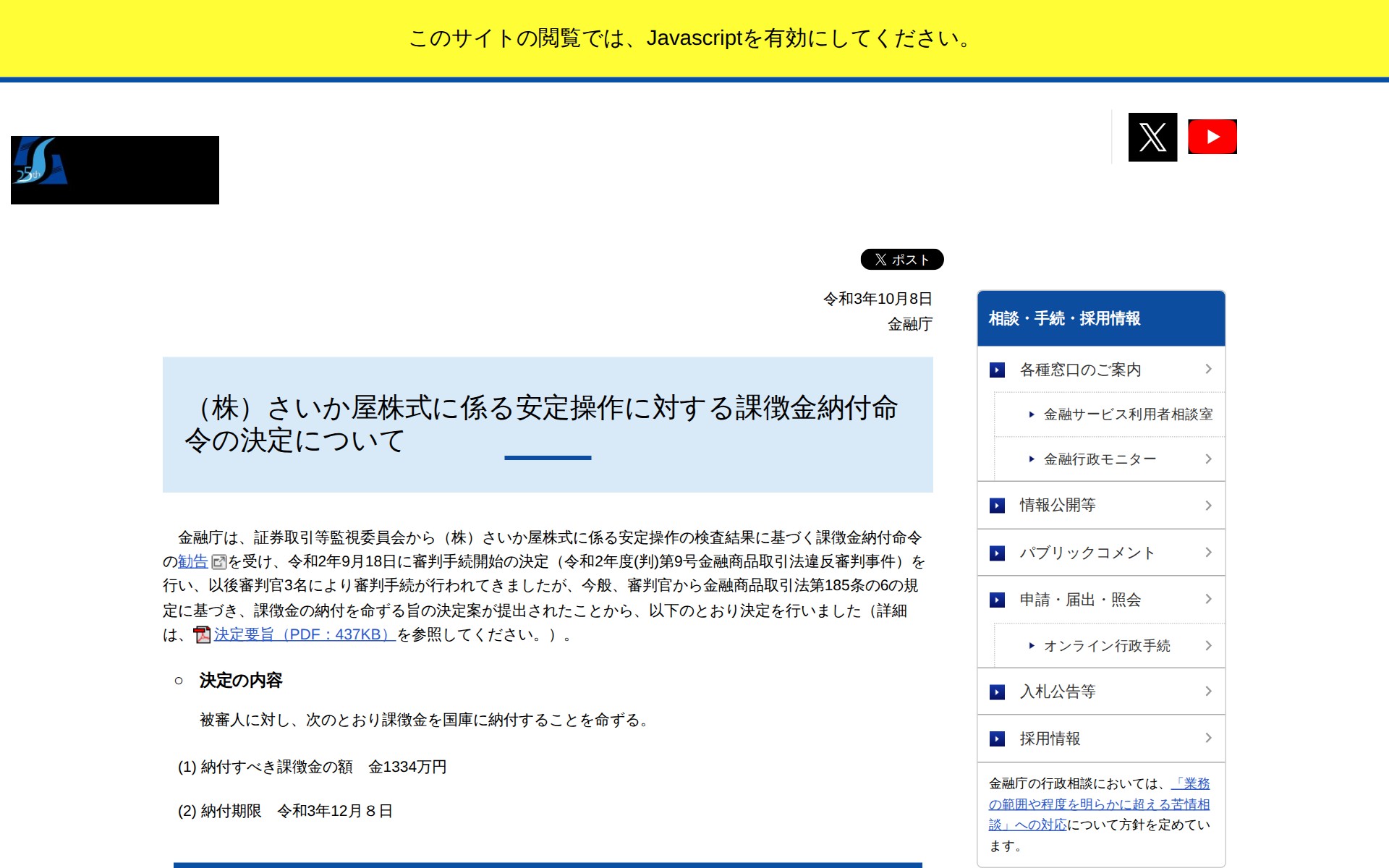 (株)さいか屋株式に係る安定操作に対する課徴金納付命令の決定について:金融庁