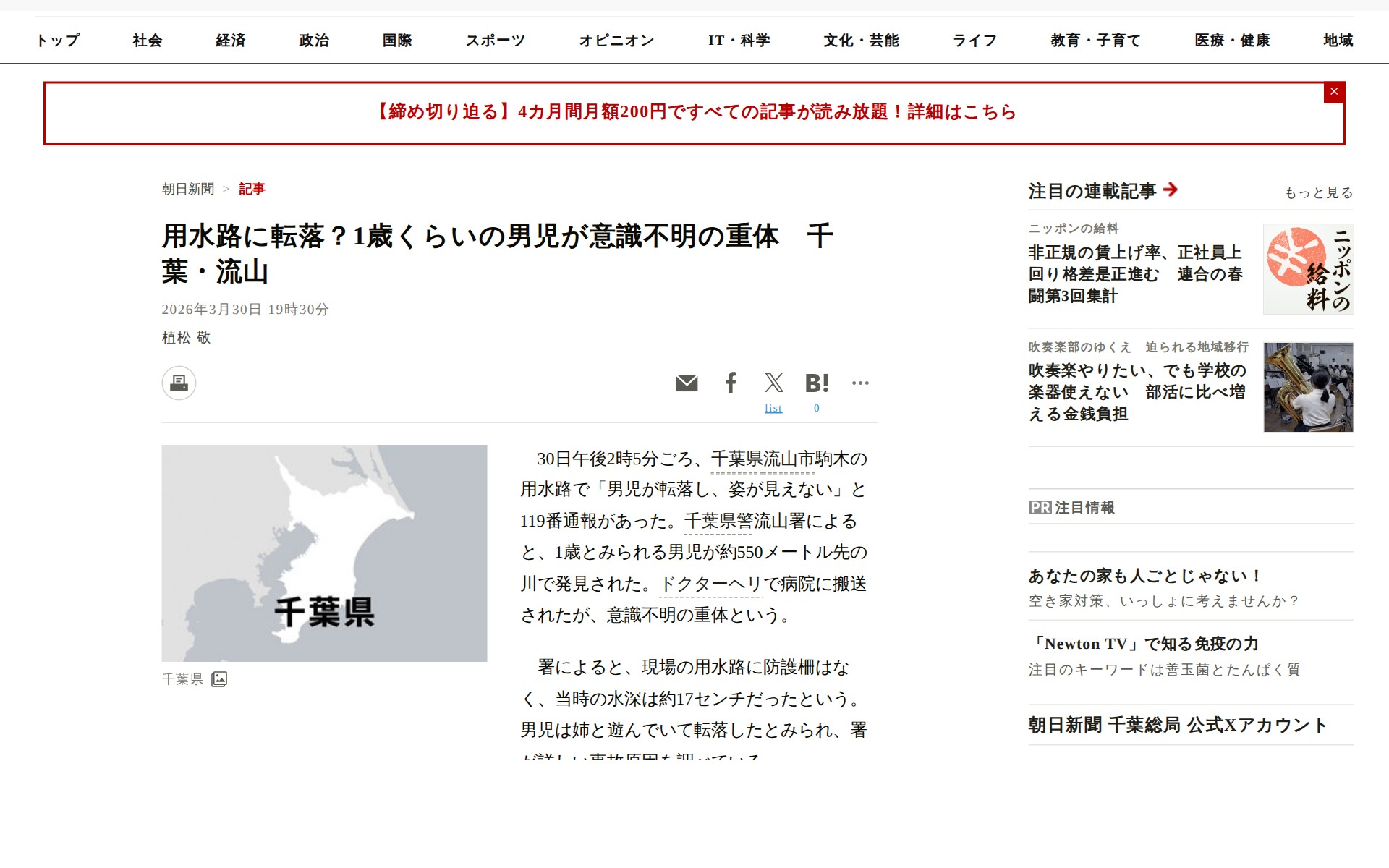 用水路に転落?1歳くらいの男児が意識不明の重体 千葉・流山 [千葉県]:朝日新聞 - 保存されたスクリーンショット