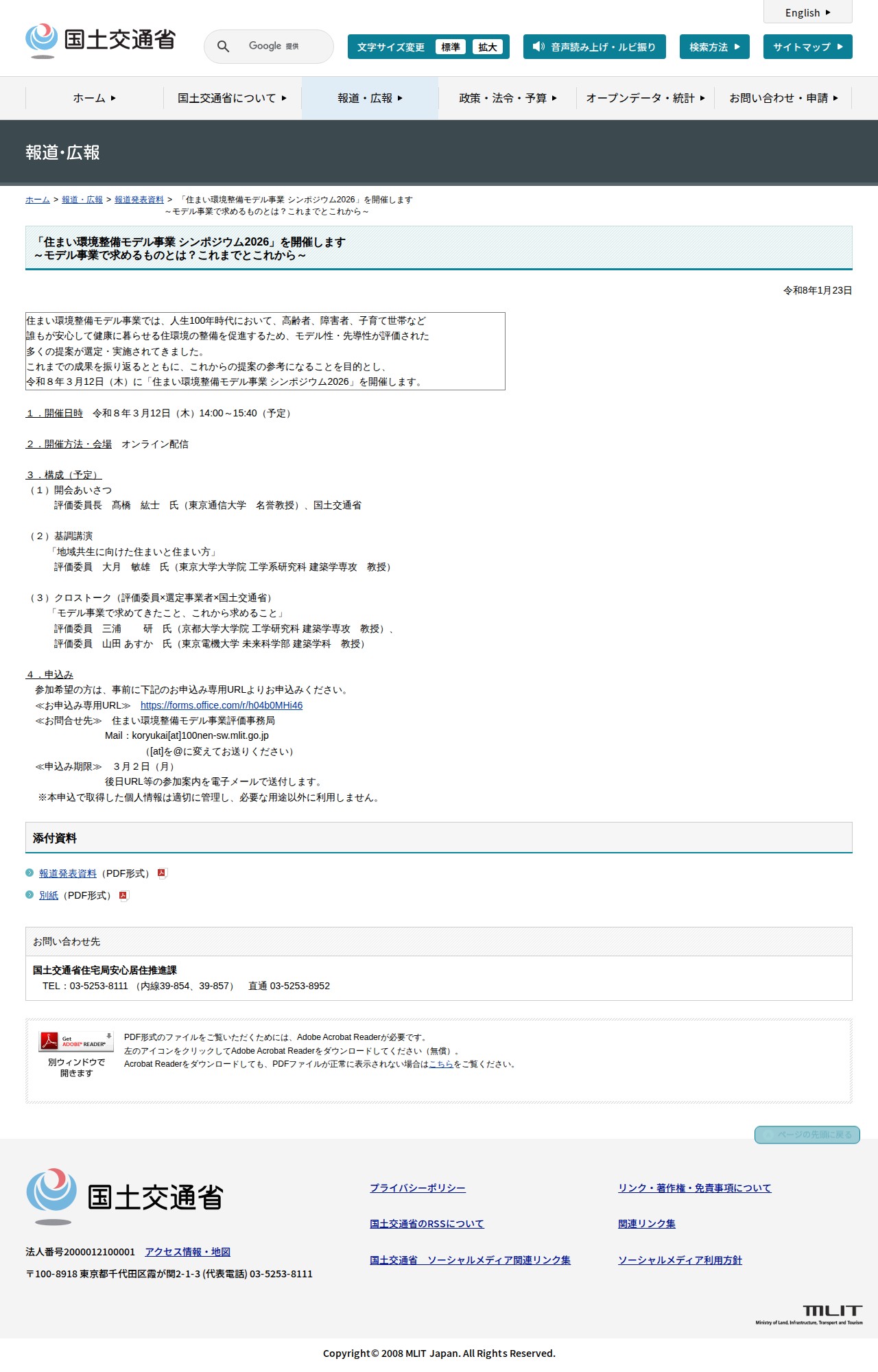 報道発表資料: 「住まい環境整備モデル事業 シンポジウム2026」を開催します<br>~モデル事業で求めるものとは?これまでとこれから~ - 国土交通省 - 保存されたスクリーンショット