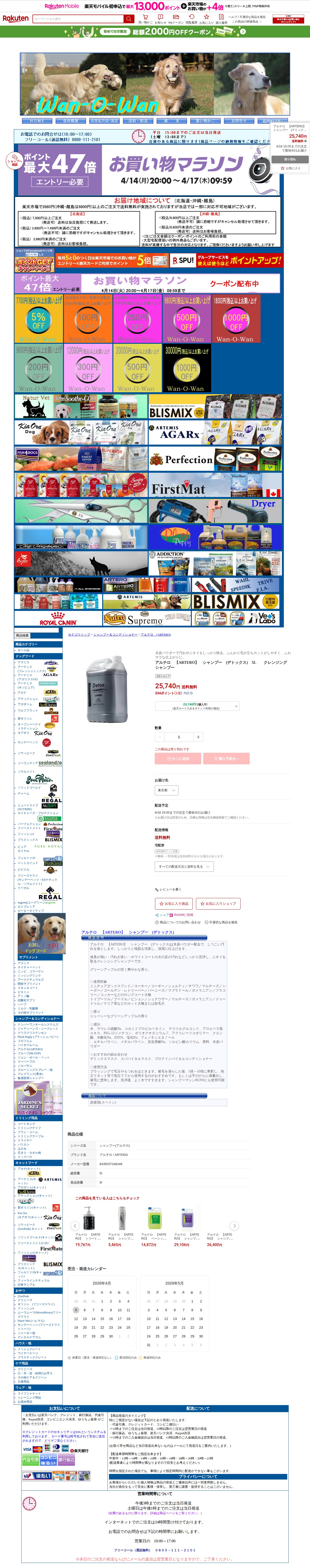 このページは、楽天市場のWan-O-Wan店舗で販売されているアルテロ(ARTERO)のデトックスシャンプー5L商品の紹介ページです。木炭パウダーを配合したクレンジングシャンプーで、犬の汚れやニオイをしっかり除去し、毛をふんわり立たせてカットしやすくするため、ふわサラな仕上がりを実現します。価格は25,740円で送料無料。4月18日15時までの注文で最短4月21日の配送が可能です。現在は売り切れ状態です。