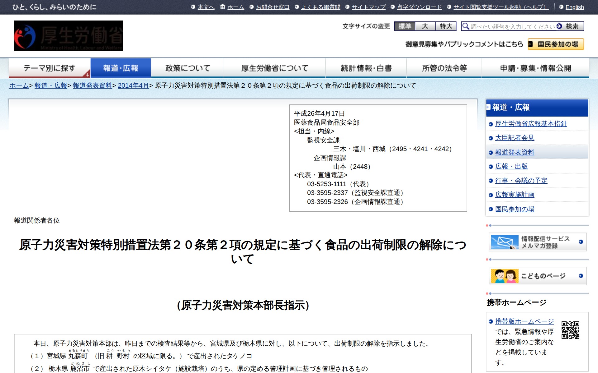 このページは、2014年4月17日に厚生労働省が発表した原子力災害対策特別措置法に基づく食品の出荷制限解除に関する報道資料である。宮城県丸森町(旧耕野村区域)産のタケノコと栃木県鹿沼市産の原木シイタケ(施設栽培で管理計画に基づくもの)の出荷制限が解除されたことを報告している。検査結果等に基づき原子力災害対策本部が指示したもので、詳細な指示内容と申請書類が別添資料として添付されている。